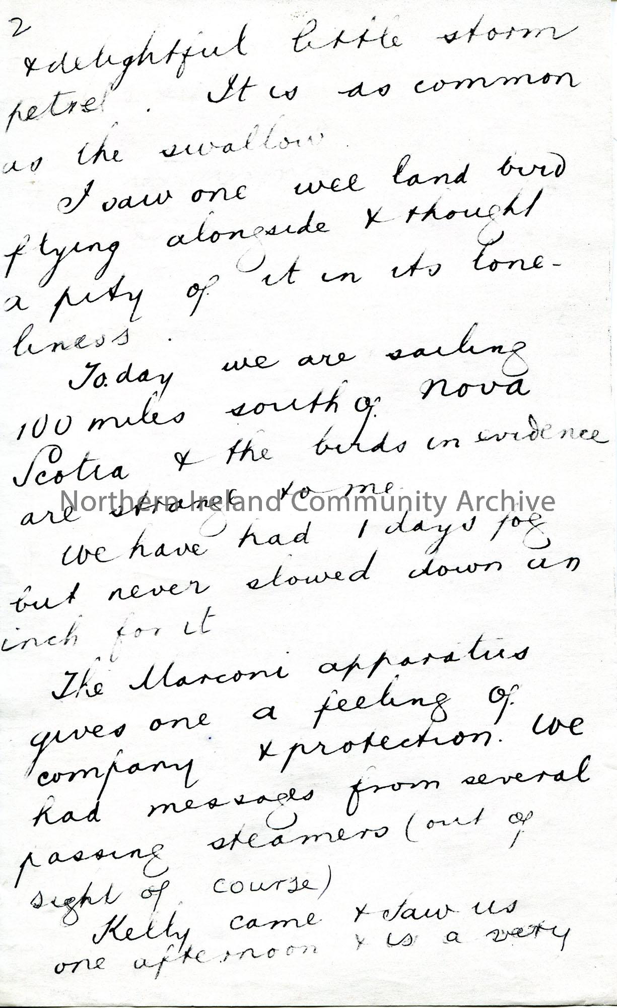 Page 4 of 8. Photocopy of a letter to Maggie from Sam Henry. Writing on board S S Furnessia. Sam is travelling with his Uncle John from Moville to New York. Writes of his sickness, involvement in on board concerts, bird life, keeping a diary, general life at sea.