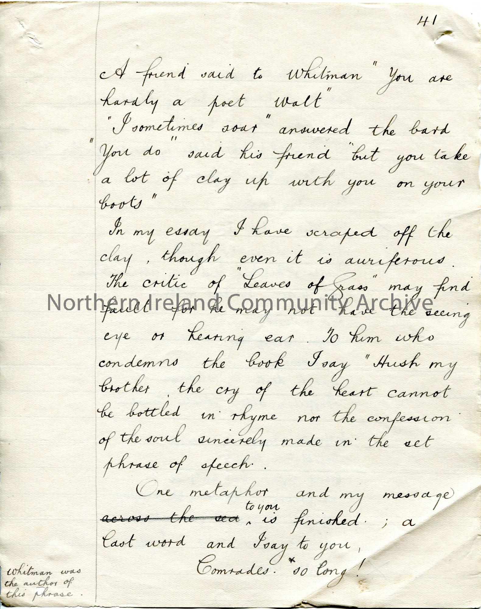 Page 41 of 43. Handwritten essay by Sam Henry titled, ‘Walt Whitman. The Bard of Personality’. Short biography of Whitman and discussion of his poetry…