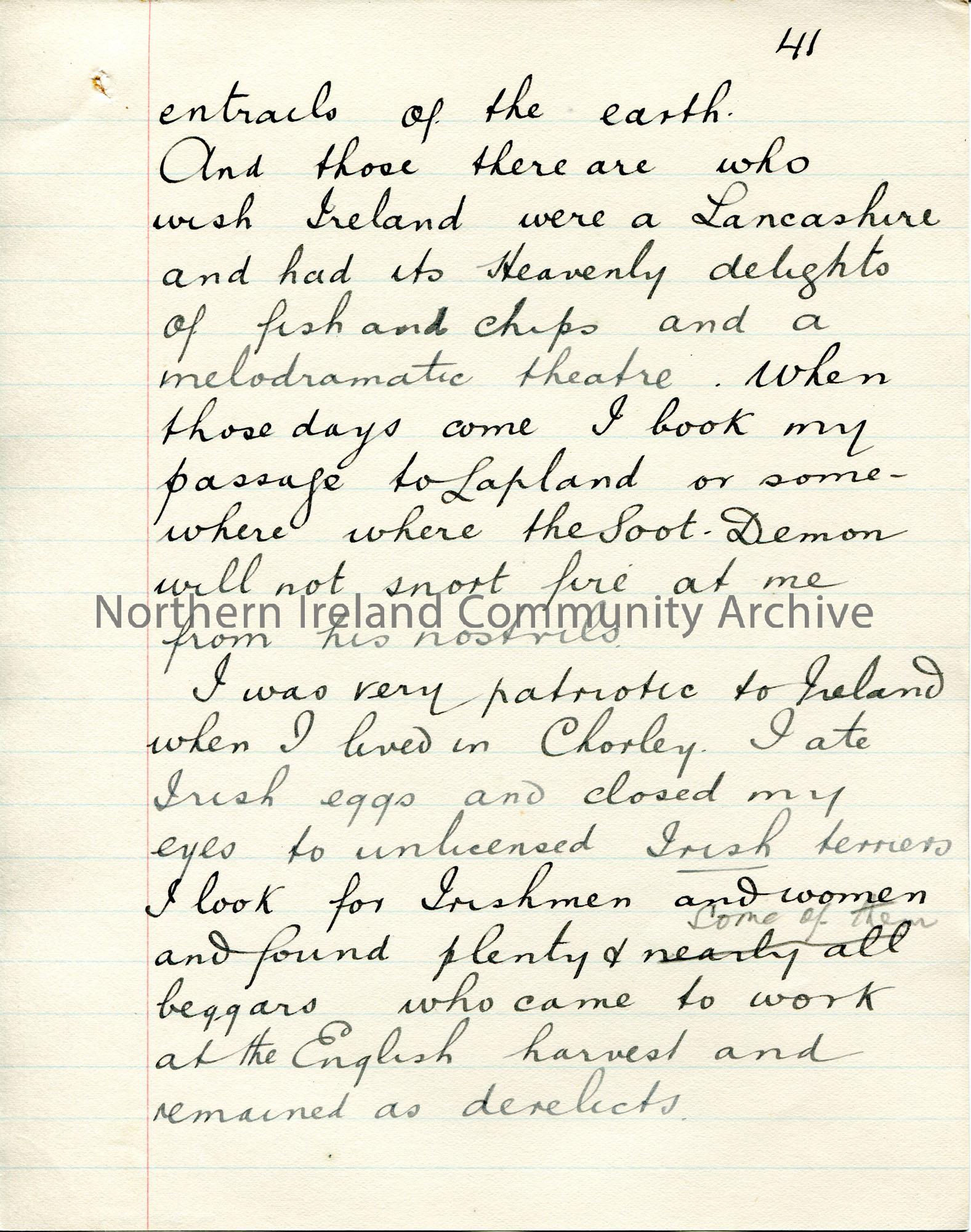 Page 41 of 71. Handwritten, rough essay [ for a talk? ] by Sam Henry titled 'Here and There in the King's Service'. Dated 1909 by JM. Sam Henry talks through his first 15 years of service as an Exciseman. He was based at Falcarragh, Ballymote in Co. Sligo, Lancashire, Uffculme and Omagh in Co. Tyrone.