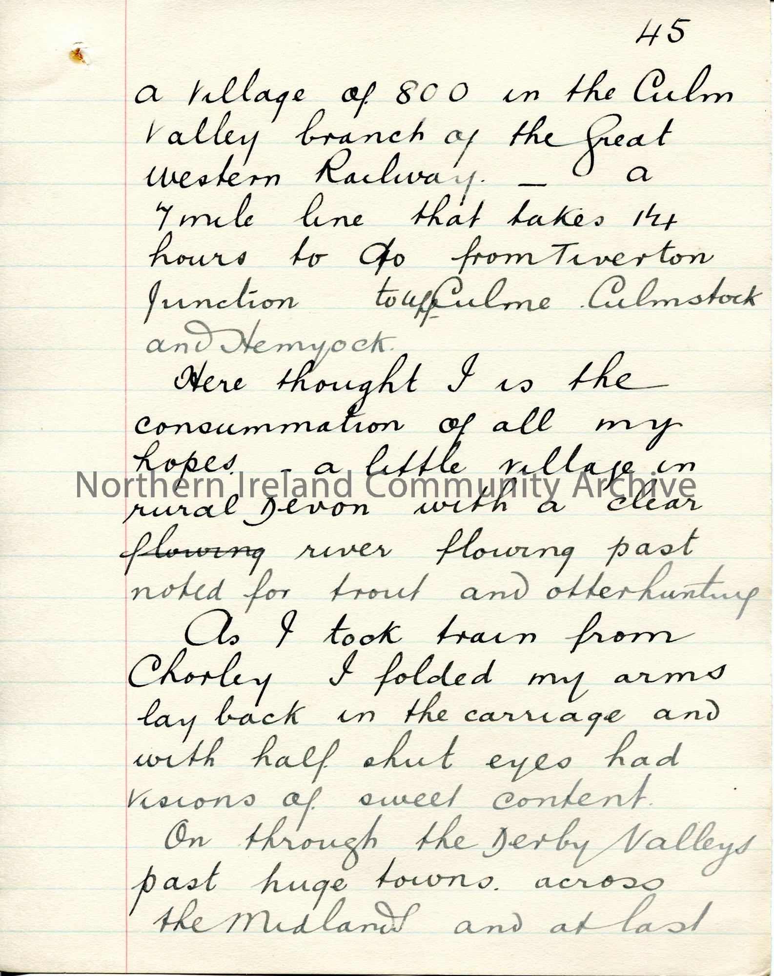 Page 45 of 71. Handwritten, rough essay [ for a talk? ] by Sam Henry titled 'Here and There in the King's Service'. Dated 1909 by JM. Sam Henry talks through his first 15 years of service as an Exciseman. He was based at Falcarragh, Ballymote in Co. Sligo, Lancashire, Uffculme and Omagh in Co. Tyrone.