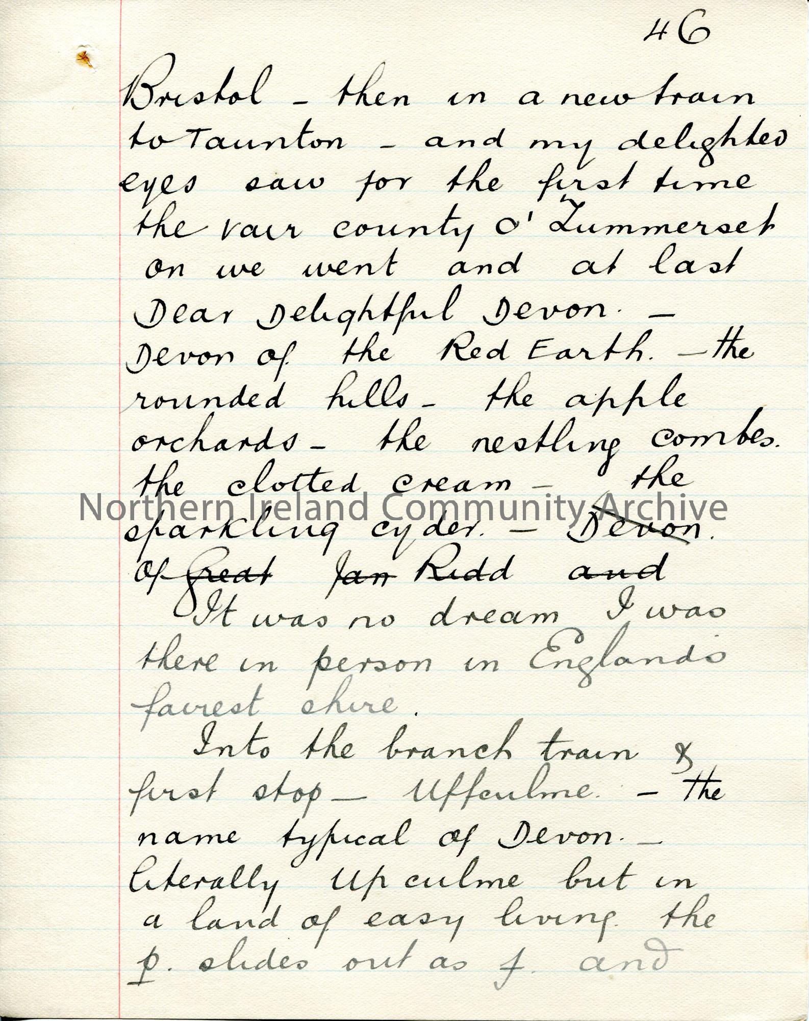 Page 46 of 71. Handwritten, rough essay [ for a talk? ] by Sam Henry titled 'Here and There in the King's Service'. Dated 1909 by JM. Sam Henry talks through his first 15 years of service as an Exciseman. He was based at Falcarragh, Ballymote in Co. Sligo, Lancashire, Uffculme and Omagh in Co. Tyrone.