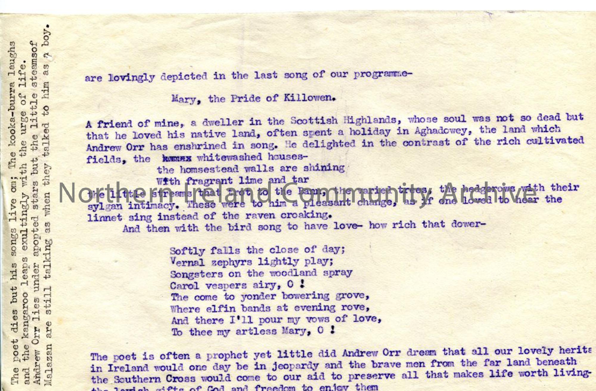 One of 4 pages of what appears to be a broadcast script on Andrew Orr. Includes biographical information on Orr, the Aghadowey area, the linen industry which he worked in, the women he loved (Ann, Mary and especially Kathleen) and mentioned in his poems, the papers he was published in. Notes on 'The Nation' on smaller piece of paper affixed to main page.