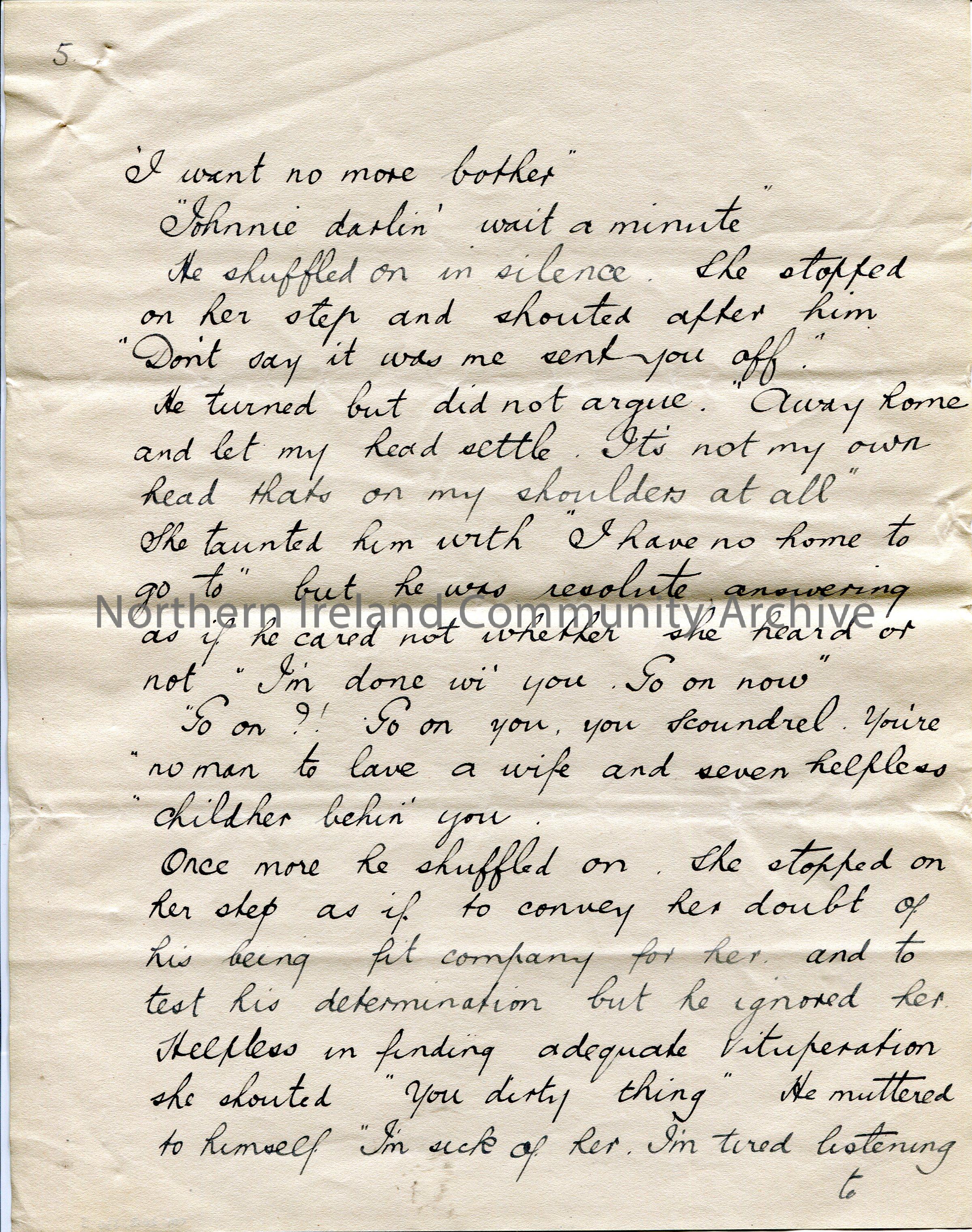 Page 5 of 10. Handwritten essay by Sam Henry titled, 'Promotion'. Re witnessing a man departing at a station as a soldier for war [WWI] and his wife who tried to stop him. Mentions Carntogher.