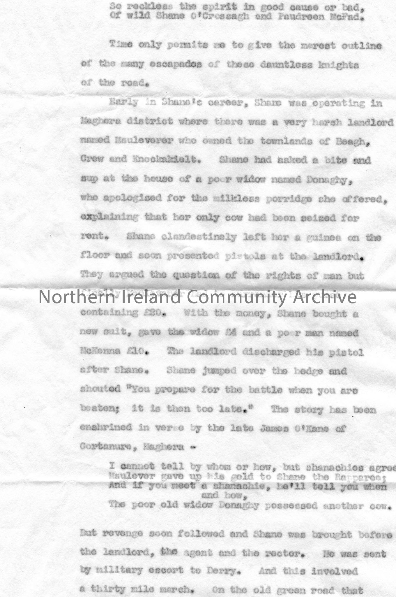 Page 5 of 11 typed script for broadcast titled, 'Irish Highwaymen and Tories. Shane Crossagh'. By Sam Henry. Saturday 26th February 7.5 - 7.20pm. Various stories involving Shane Crossagh - the Derry Rapparee.