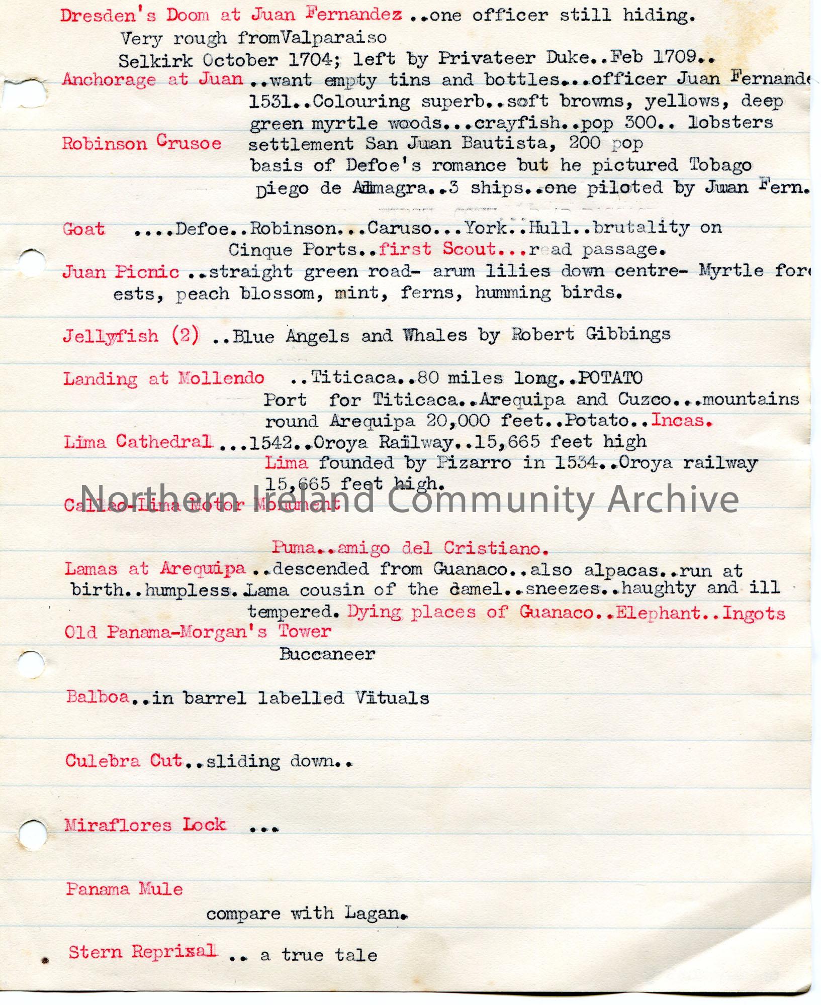 Page 5 of 12. Typed list on lined paper of placenames and terms re South America.
