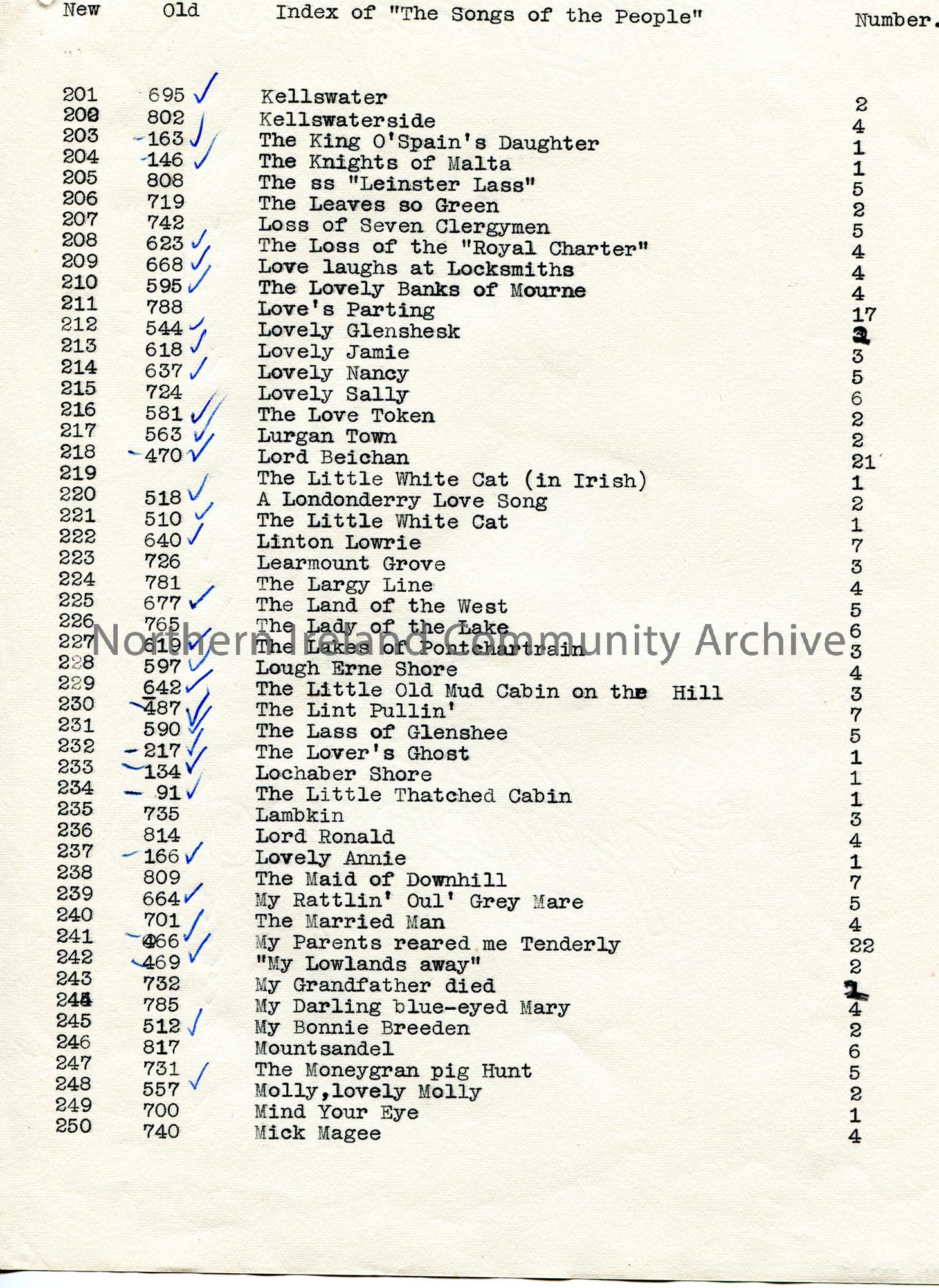 Page 5 of 19. Typed list of songs and song numbers titled, ‘Index of “The Songs of the People”‘. Some song numbers are ticked with blue Biro pen.