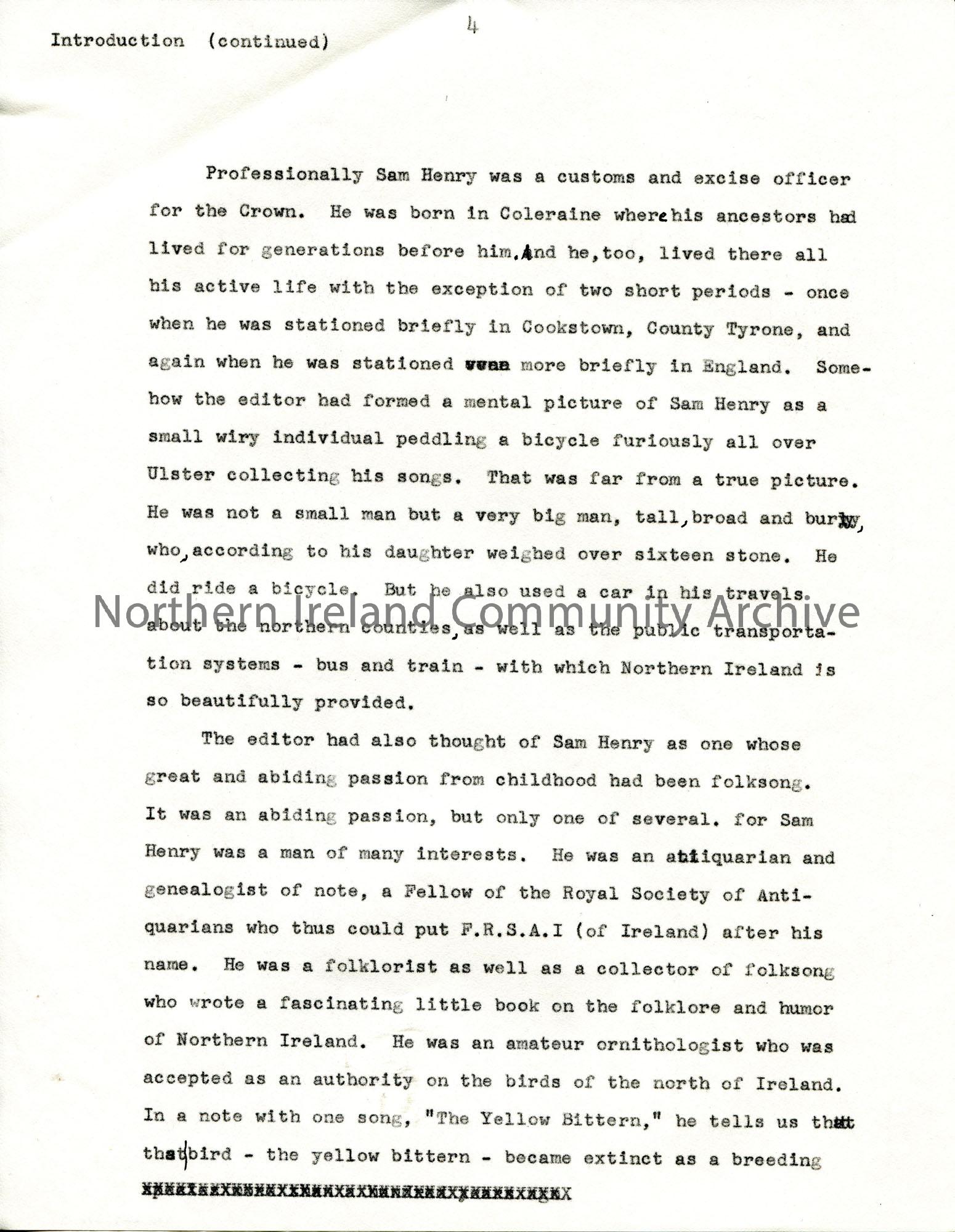Page 5 of 28. Typed manuscript for Sam Henry's Songs of the People edited by Gale Huntington. Annotated in black ink. Includes the introduction, text re Child Ballads, Laws Ballads, Other Ballads, Songs and Ballad-Like Songs, Chanteys, Lullabys and Signing Games, Bibliography and Index.