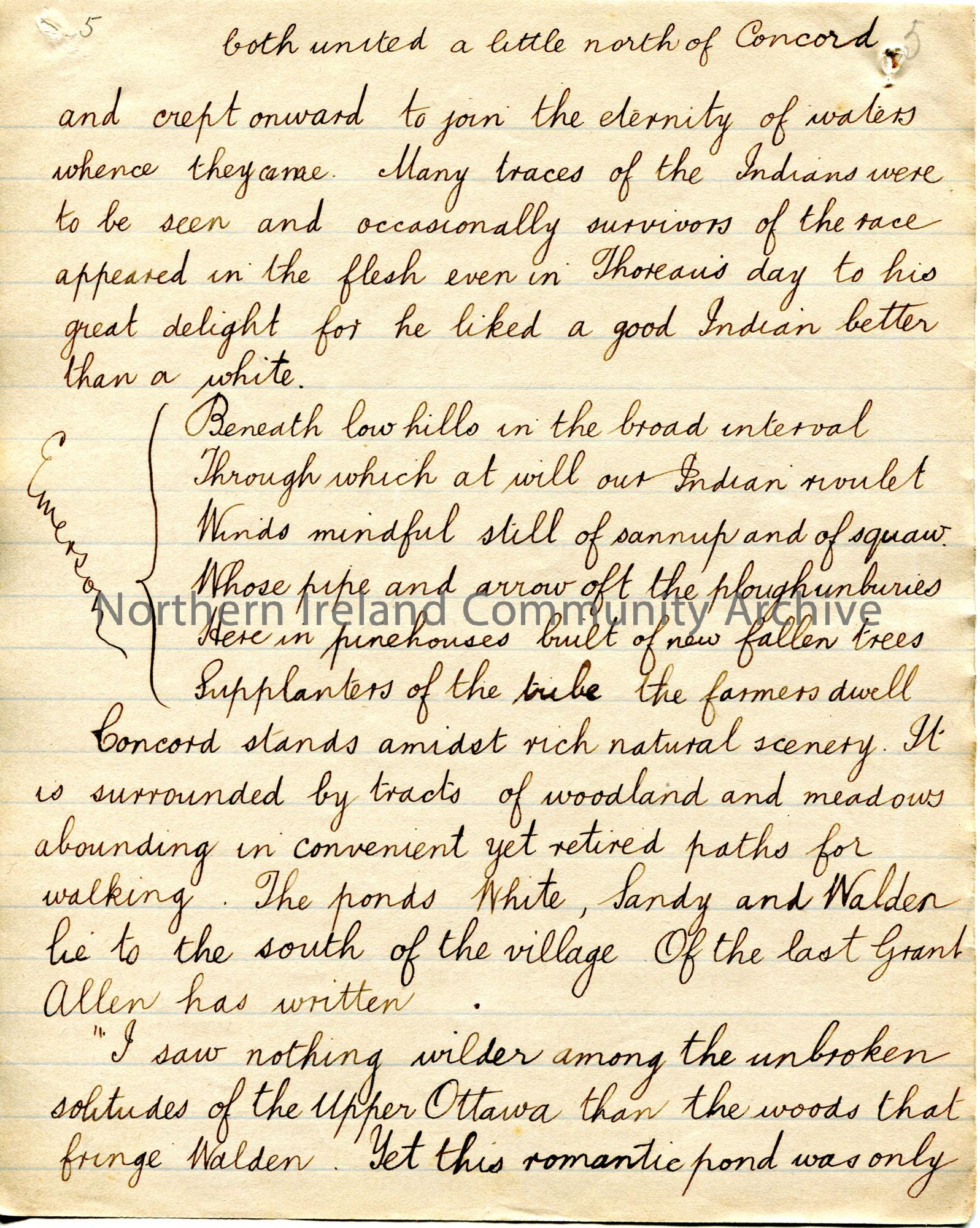 Page 5 of 38. Handwritten essay by Sam Henry titled, ‘The Hermit of Walden’. Philosophical essay re Henry David Thoreau. Sam presents this essay to th…