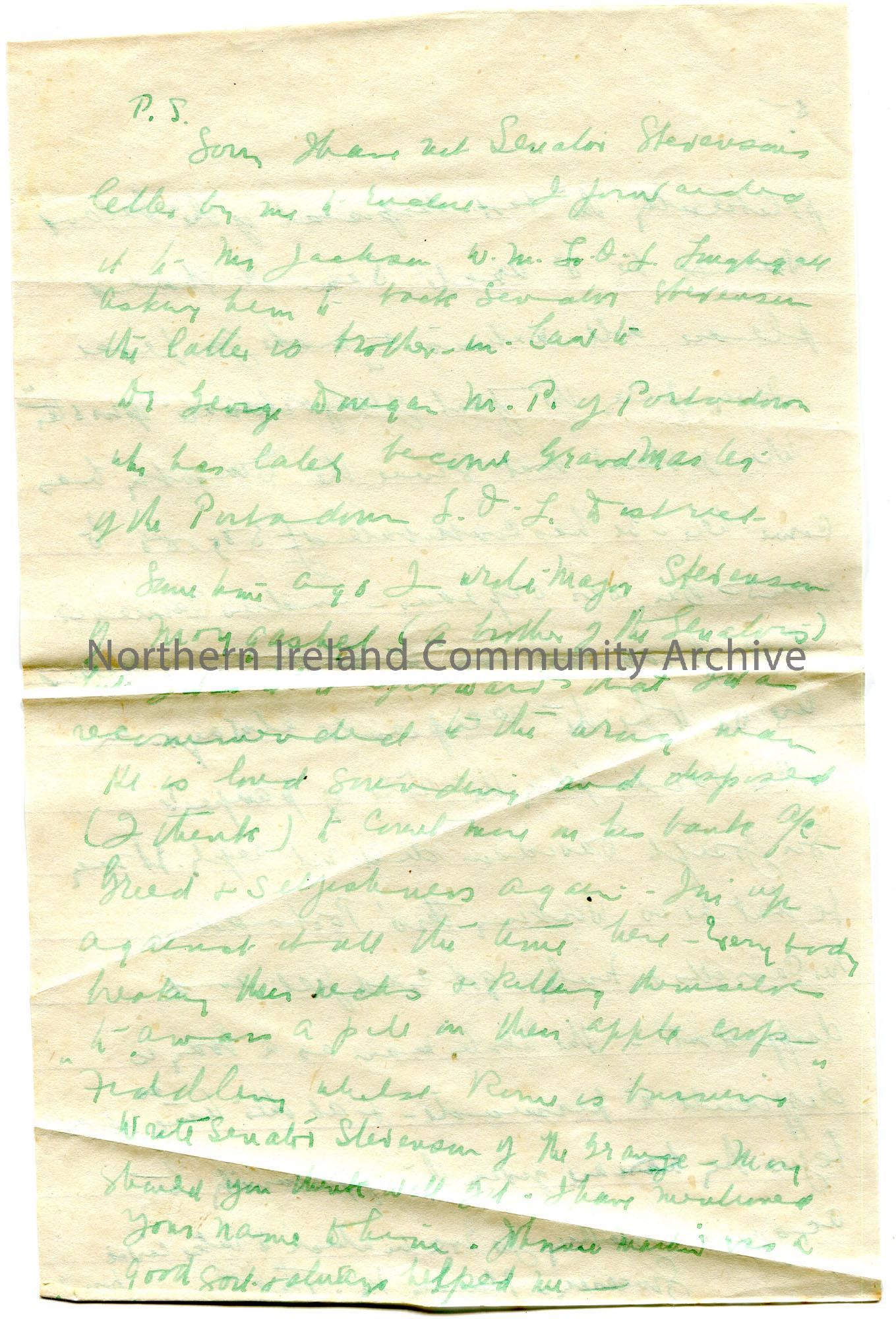 Page 5 of 5. Handwritten letter (double sided) on lined paper in green ink to Sam Henry. Mentions a meeting of Loughgall L.O.L and their possibility o… – scan063f