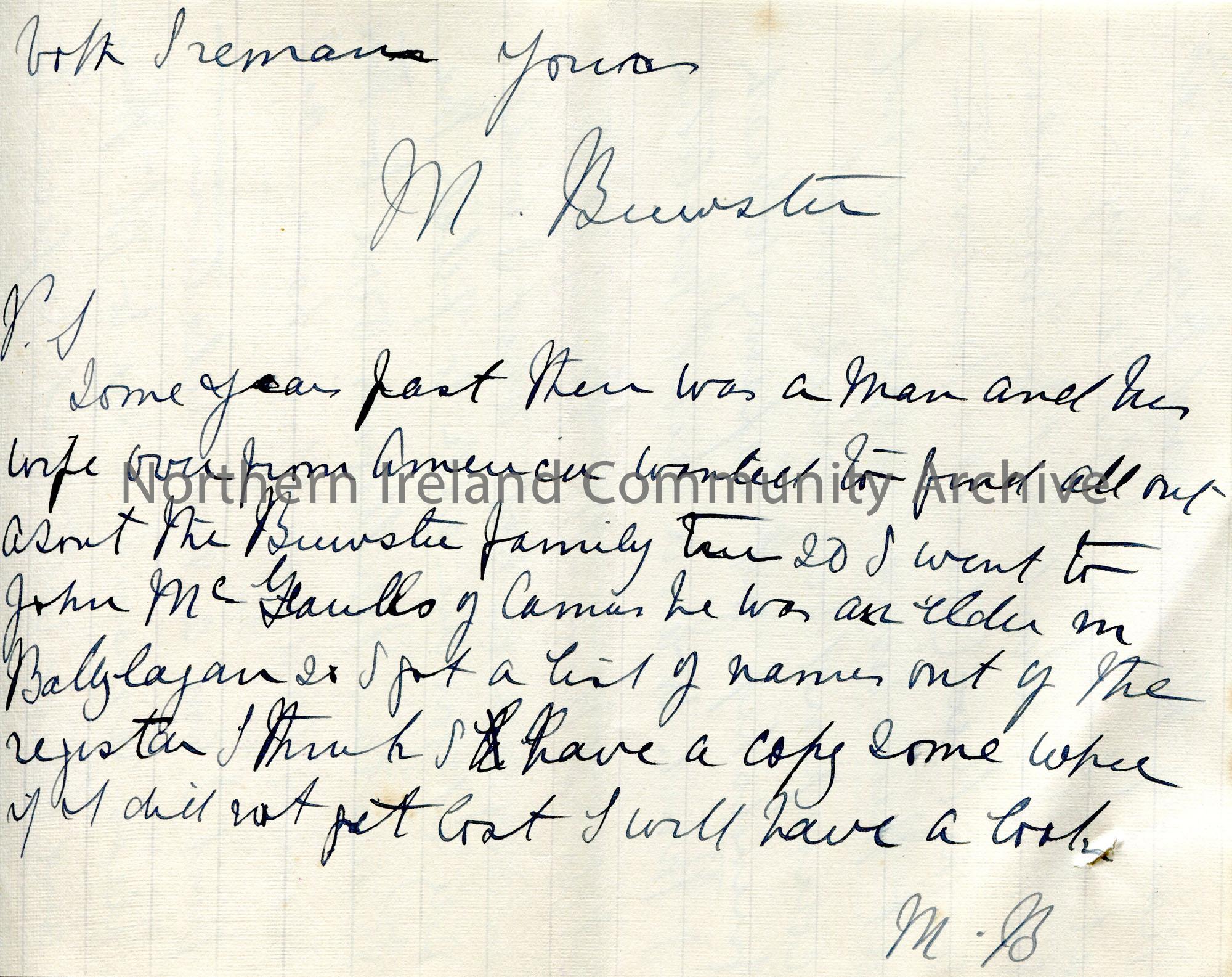 Page 5 of 5. Handwritten letter Sam Henry from M. Brewster. Answering some questions for Sam re the family Brewster. – scan010f