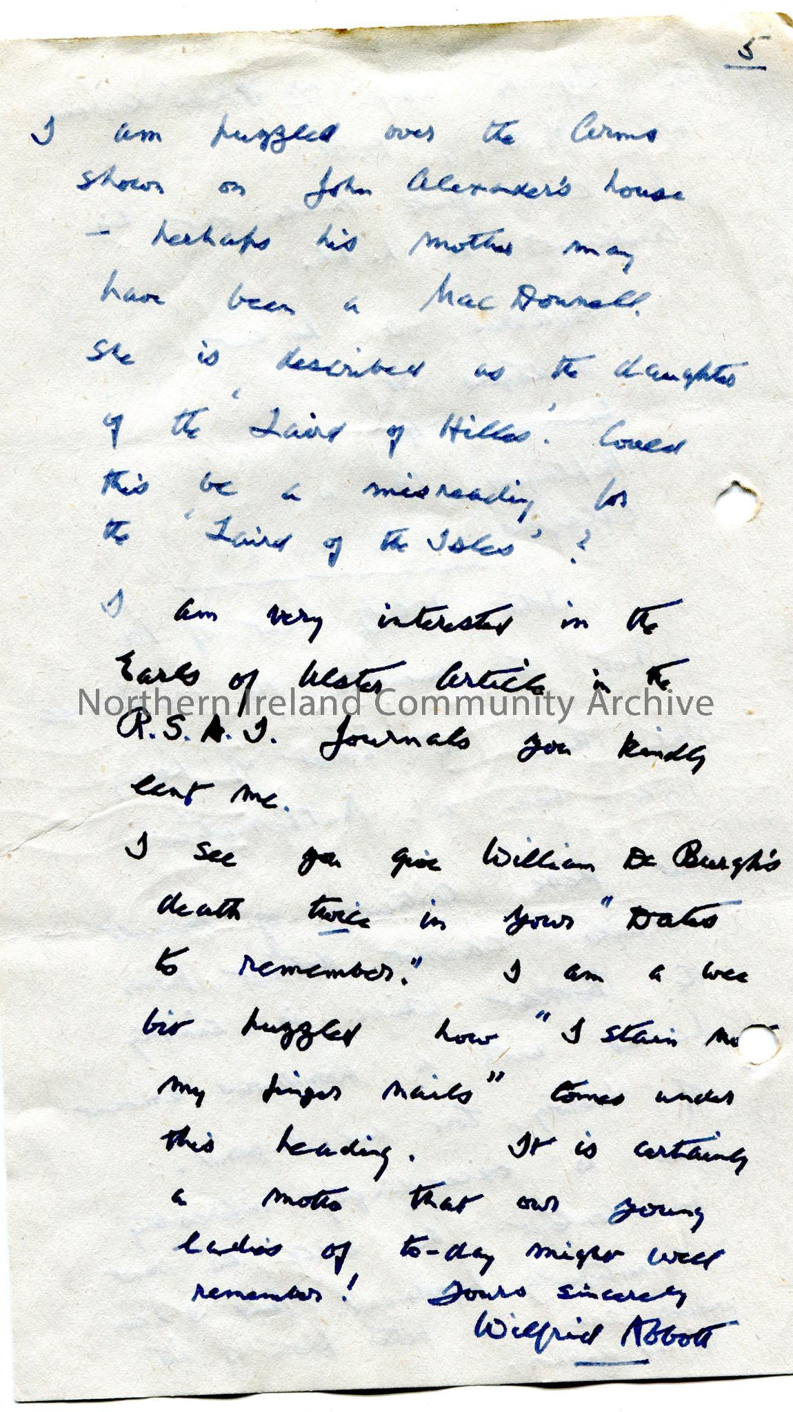 Page 5 of 5. Handwritten letter to Mr Henry. Congratulates Sam on his 'Dunluce and Giant's Causeway' booklet. Discusses his interest in the MacDonnell Arms and Antrim Arms. Mentions John Alexander of Limavady. Writes that he is interested in the 'Earls of Ulster' article in the R.S.A.I Journal.
