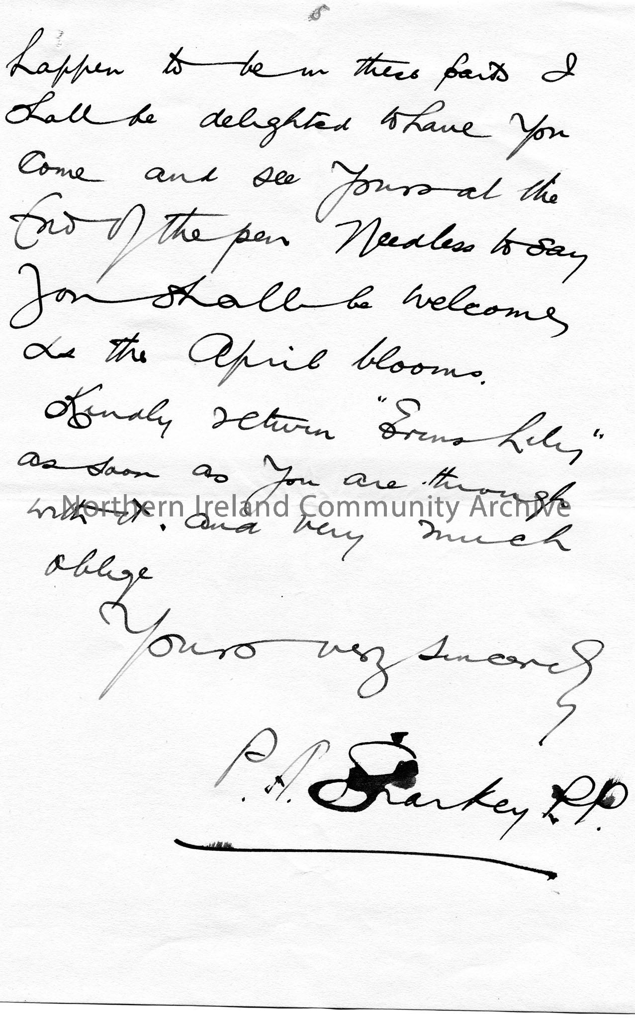 Page 5 of 5 of handwritten letter to Sam Henry, Sandelford, Coleraine. Several words are underlined or written in upper-case. Writing re the claim that Turlough O'Carolan composed the song 'The Star Spangled Banner'. To send Sam a book called 'Erins Lily'. Mentions a book 'The Heart of Ireland' which he wrote as the result of saving his friend from eviction. Mentions Henry Grattan Flood.