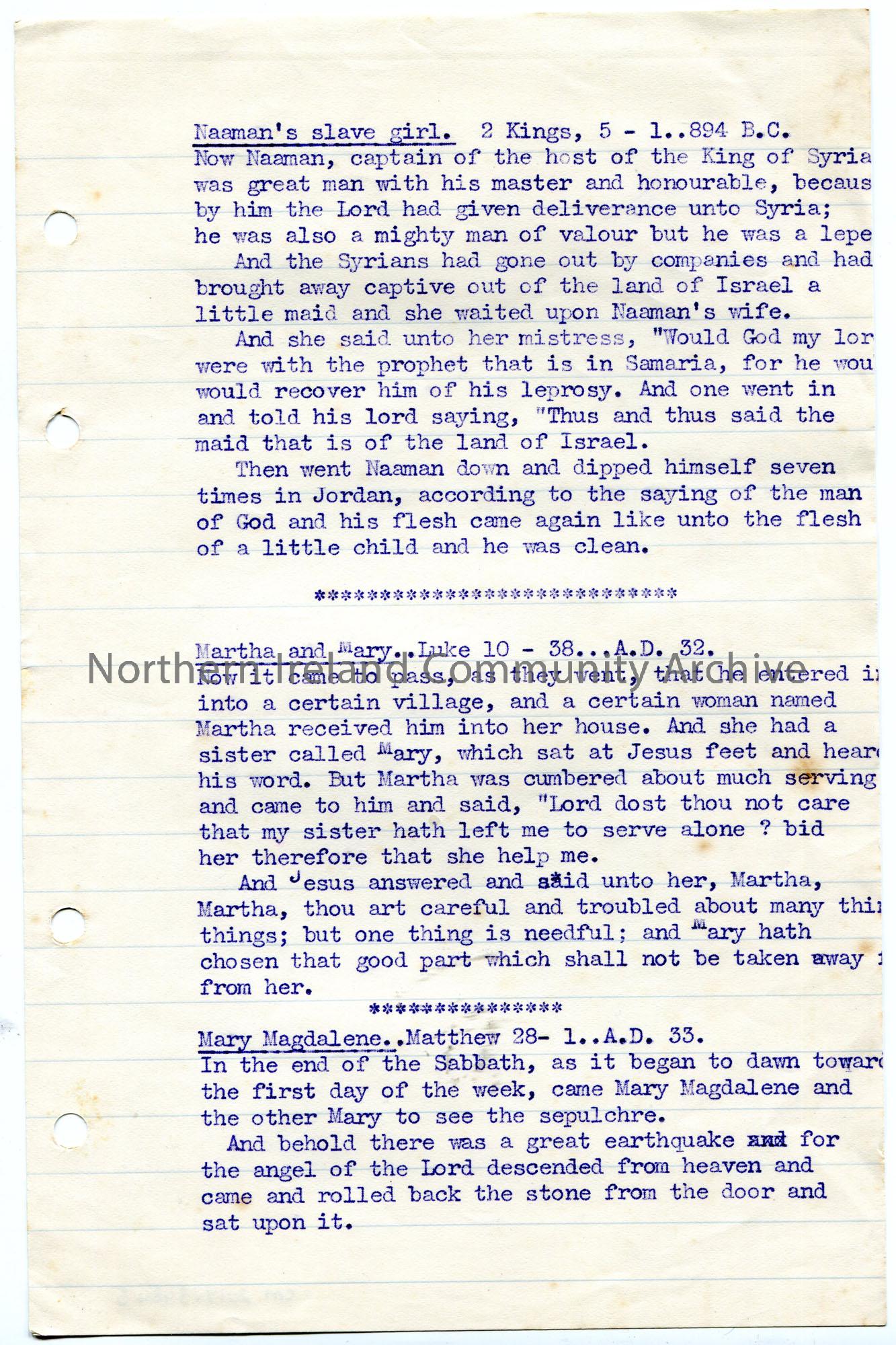 Page 5 of 5. Typed notes on lined paper for a Bible Class addressed to women. Talk is about women in Biblical times. Mentions Naaman's slave girl, Martha and Mary and Mary Magdalene.
