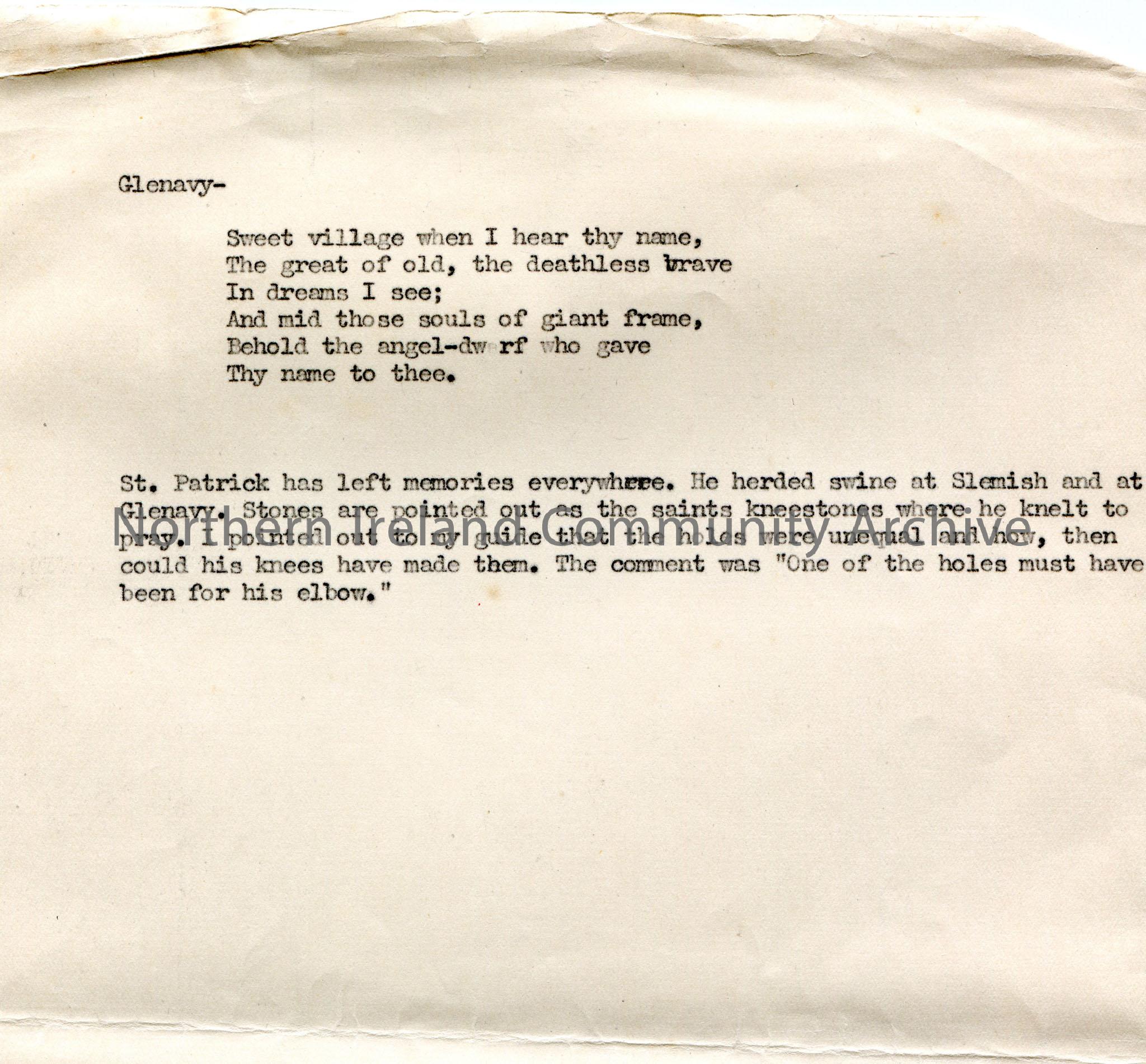 Page 5 of 5. Typed script for broadcast titled, ‘Undiscovered Ulster. Co. Antrim.’ Re stories of the history of places and people in Co. Antrim. Refer…