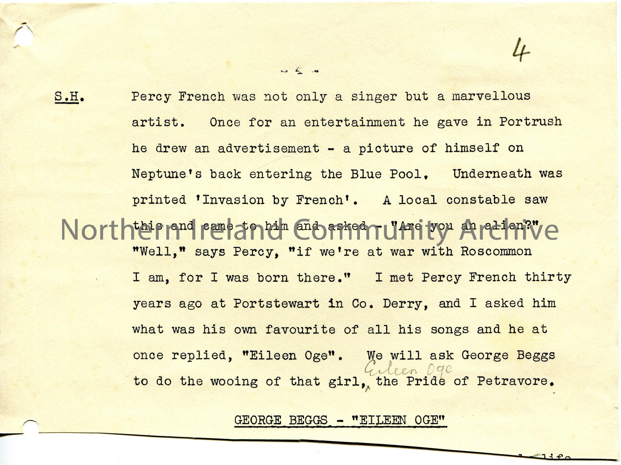 Page 5 of 6 of a typed script for broadcast titled, ‘Phil the Fluter’s Ball’ from the BBC. Story of songs by Percy French narrated by Sam Henry. Part …