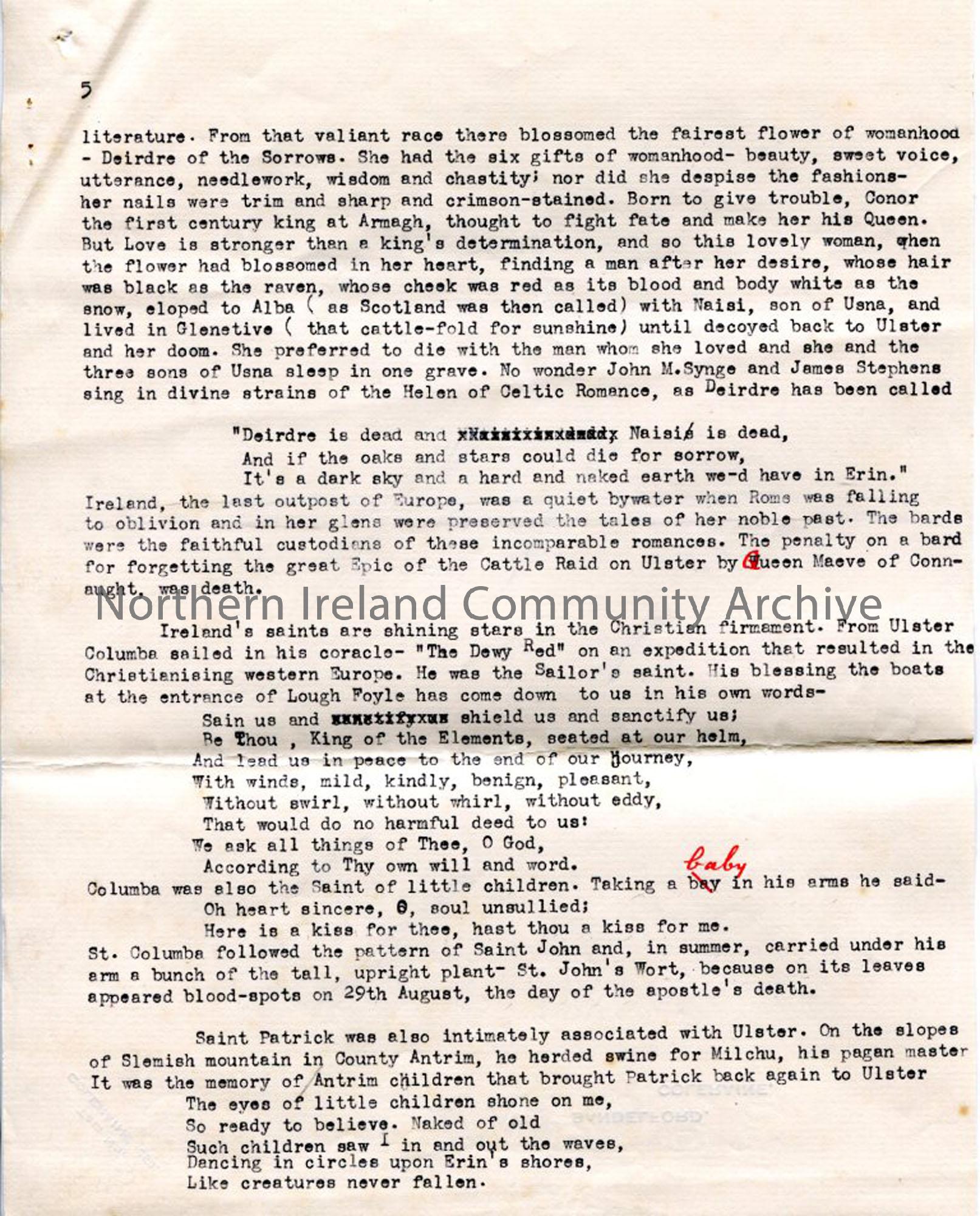 Page 5 of 6 typed pages of script for the broadcast 'Old Customs and Legends of Ulster', sent out across USA and Canada - folklore stories, saints, cures for disease, traditional practices.