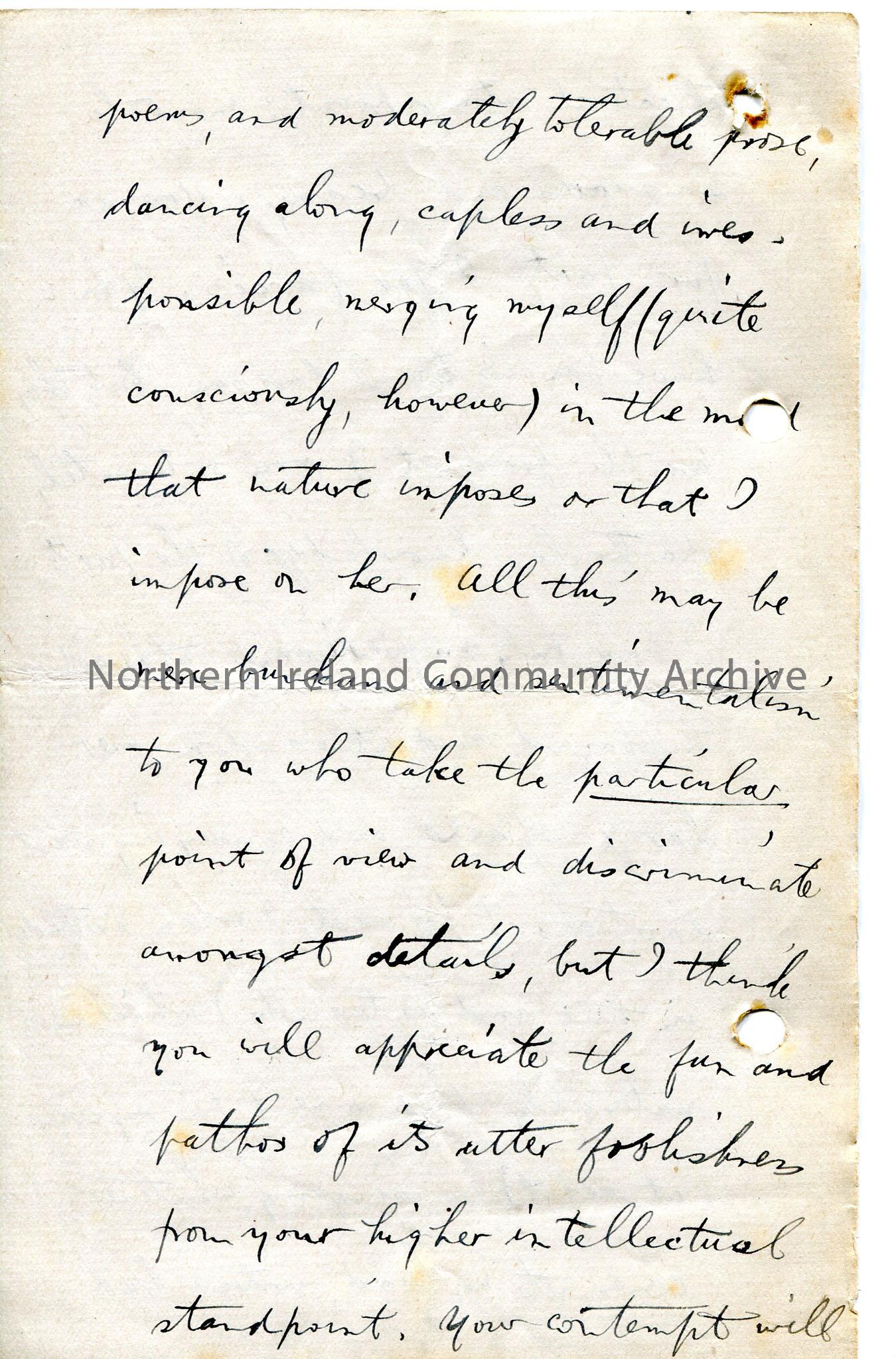 Page 5 of 6 page handwritten letter, on both sides of paper. Discusses his working hours, then a love of nature shared with Sam - elaborates, describing walks e.g. from Cranagh to Barmouth and the sights and sounds along the way