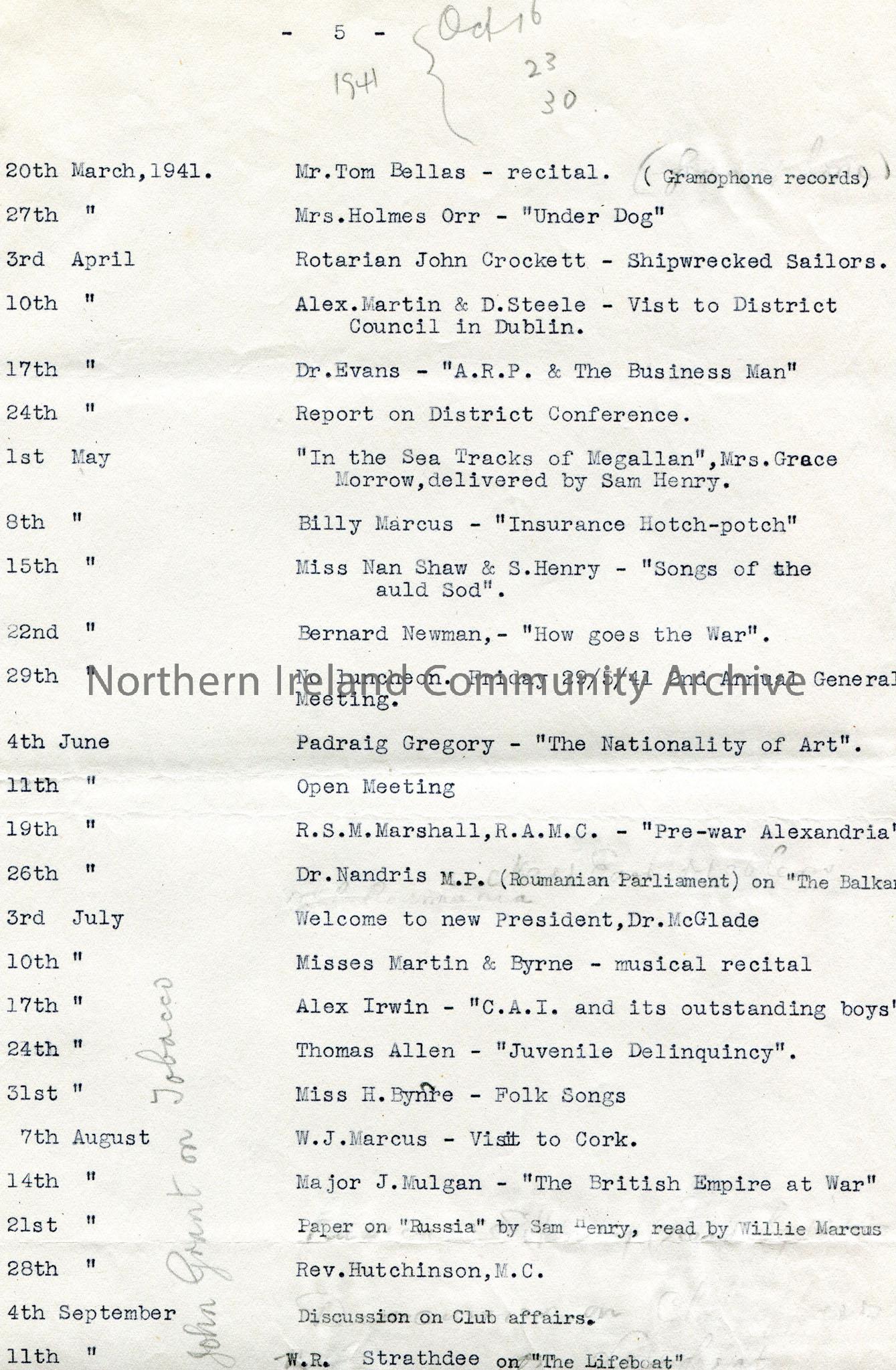 Page 5 of 6 titled ‘Coleraine Rotary Club, Talks at Weekly Luncheons’. Dates from 2nd February, 1939-2nd April, 1942. On reverse of last page is a for…