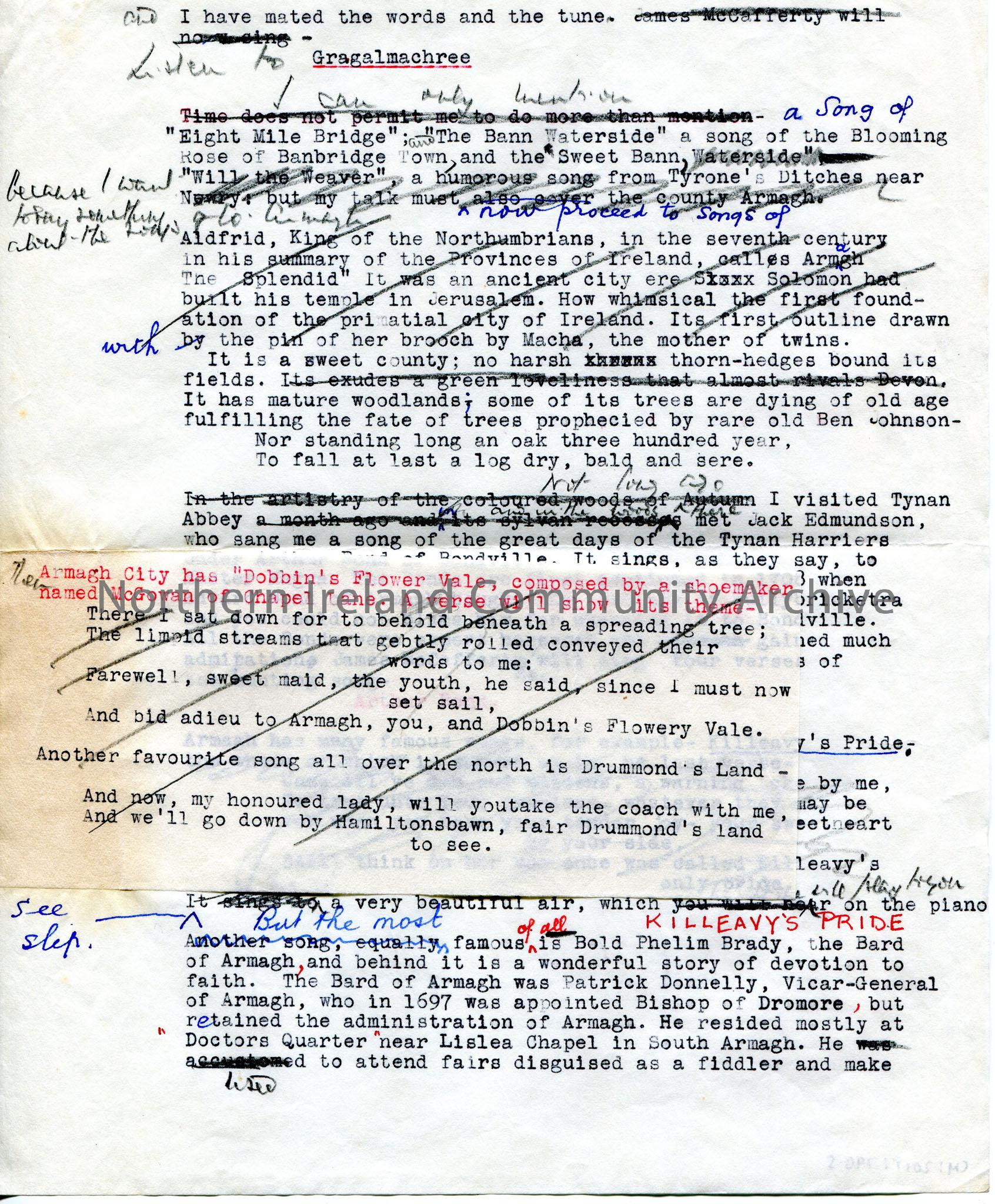 Page 5 of 6. Typed script, rough annotated copy, for broadcast, titled, ‘Songs of Down and Armagh.’ Same script as CM:2017:789.1-4. ‘All songs in red’… – scan067e