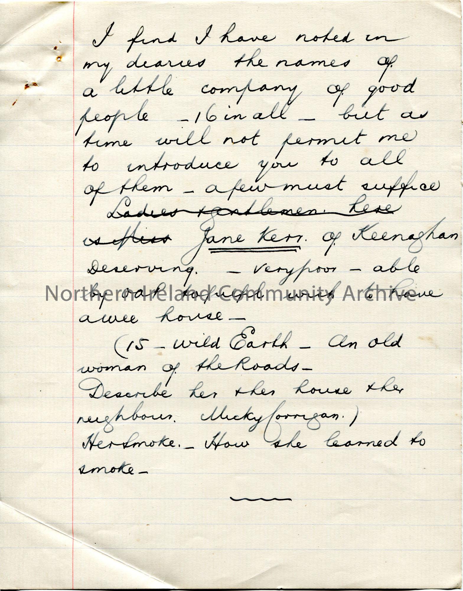Page 5 of 8. Handwritten notes as part of several pages for an evening of entertainment by Sam Henry at the meeting of New Row Association on 7th February 1911. Titled, 'An Irish Miscellany'. Re characters Sam has met in various parts of Ireland - Jane Kerr, John Taggart, Bernard O'Neill, John Wright, Francis McDonald, Katie Fullan, John Gartland, Sarah Agnew, John Ryan . Includes an itinerary of the evening performance.