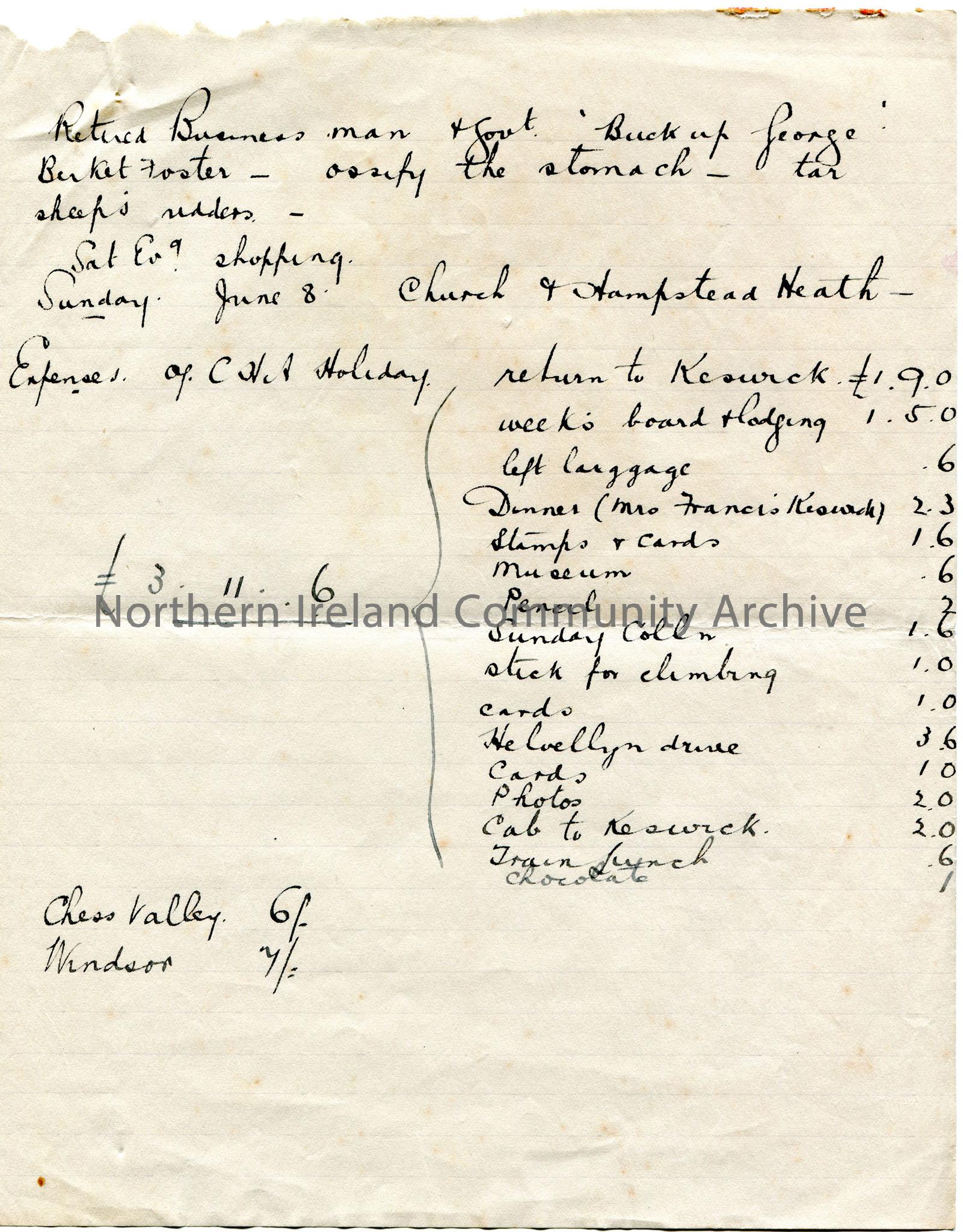 Page 5 of 8 of handwritten notes titled, ‘Holiday 31 May-19 June 1913’. Details of daily activities of travels around England.