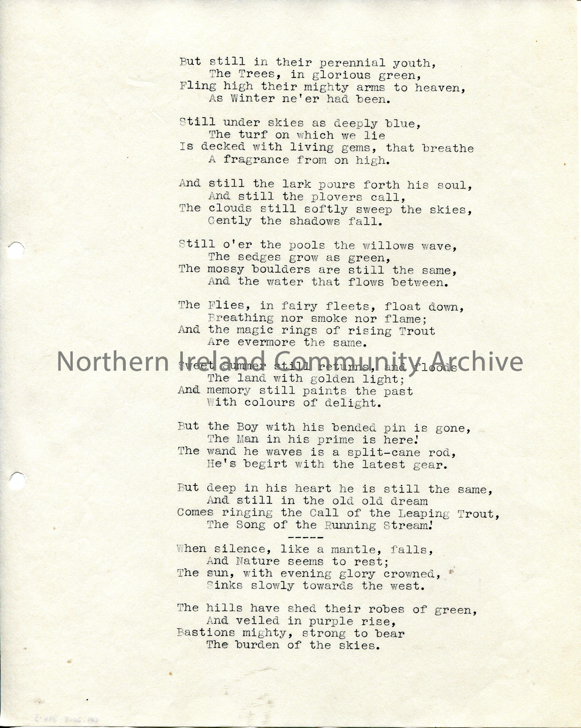 Page 5 of 8. Typed poem titled, ‘The Trout, A Song of the Running Stream’.