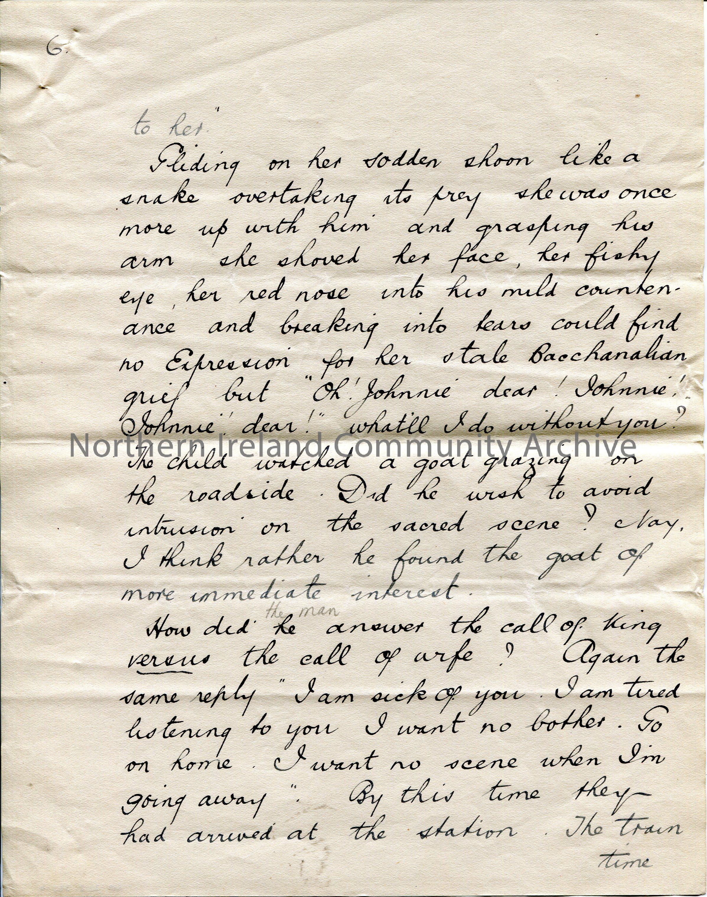 Page 6 of 10. Handwritten essay by Sam Henry titled, ‘Promotion’. Re witnessing a man departing at a station as a soldier for war [WWI] and his wife w…