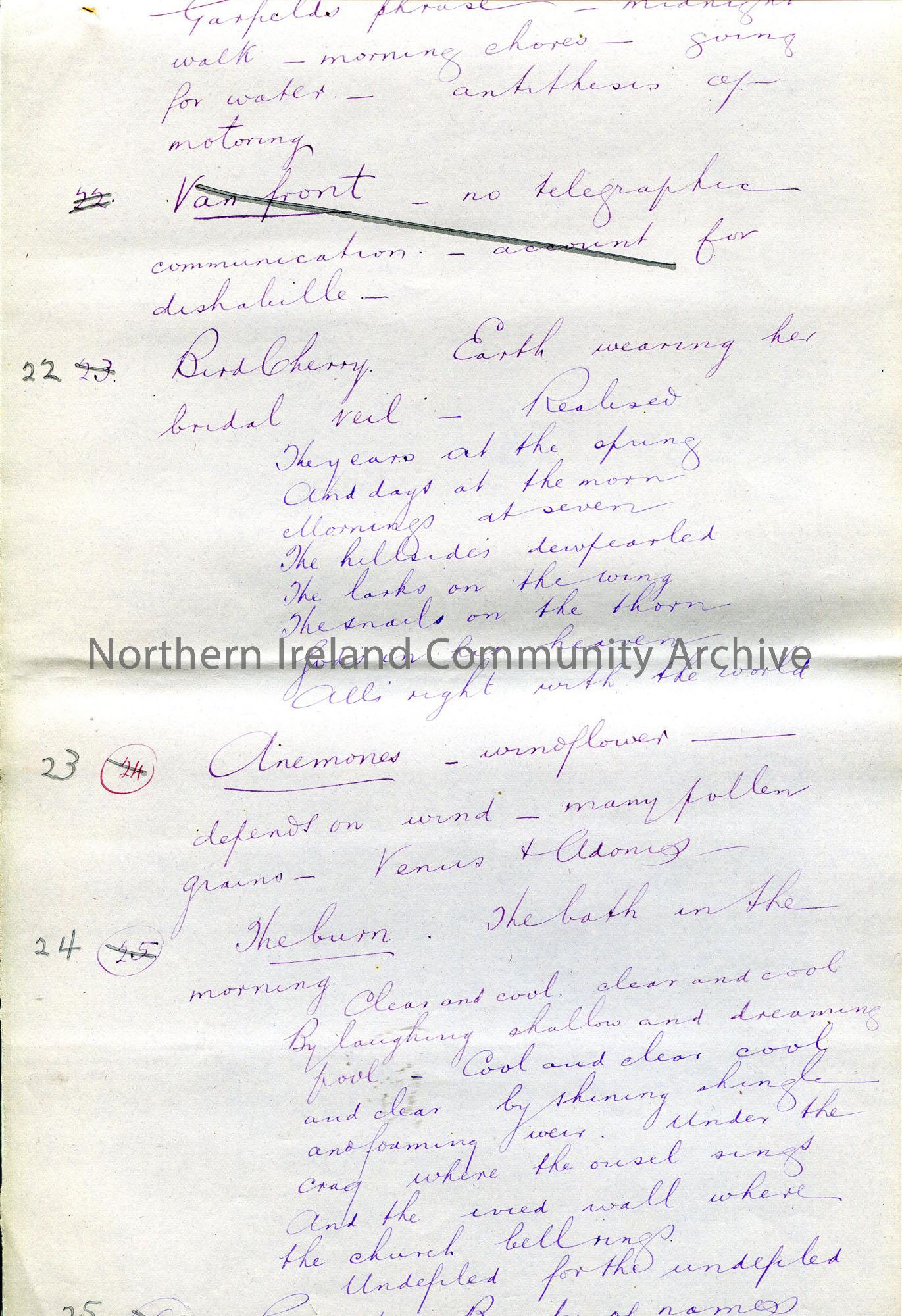 Page 6 of 10. Handwritten rough notes (blue paper) for lecture by Sam Henry titled, ‘On way to Lough na Tarpoge’. Notes are numbered for slides 3-41. …
