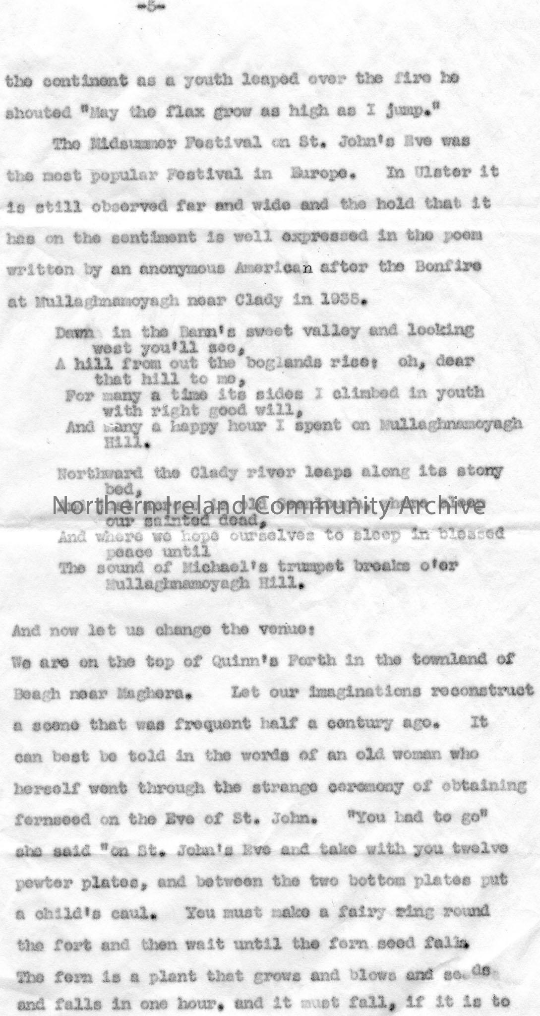 Page 6 of 10. Typed talk for broadcast. Titled, ''Ulster Customs' Midsummer by Sam Henry. Wednesday, May 11th, 6.00-6.15p.m. Page 9 is missing. Talk re customs and traditions of fire and flowers. Midsummer Festival held on St. John's Eve on 23rd June with stories re Moneygran near Kilrea. Refers to the McGrath family name. Writes of Beagh near Maghera and its custom re flowers, fern seeds and invisibility. Also writes of the customs surrounding fish and refers to the Merchant Tailors Company and Salmon Leap, Coleraine.