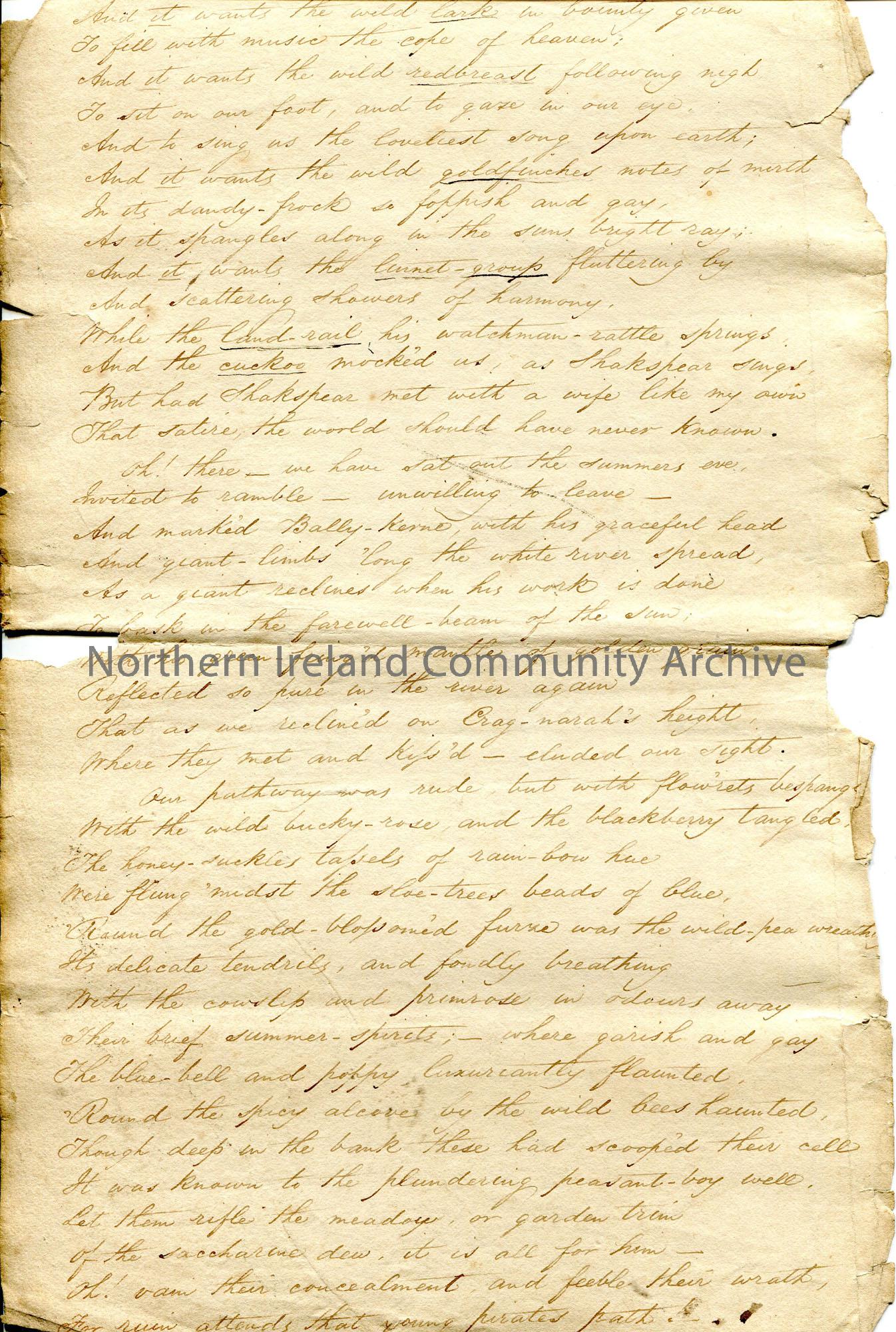 Page 6 of 12. Handwritten verses of poetry. Some of which are untitled. Titled pieces - 'The Emigration', 'L'Amour' Translated from the French 1814, 'The Shift' 1812, 'The Stranger-Hound. A Dunmull Legend' 1812, 'Impromptu, On my Birthday' 21st December 1809, 'To My Flute' 1807, 'Prologue to Speed the Plough' 1806 and 'Occasional Address. Spoken at the opening of the private theatre, Colerain' 1806.