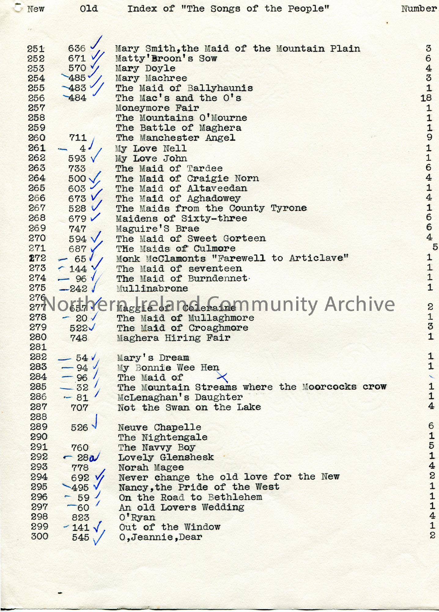 Page 6 of 19. Typed list of songs and song numbers titled, ‘Index of “The Songs of the People”‘. Some song numbers are ticked with blue Biro pen.