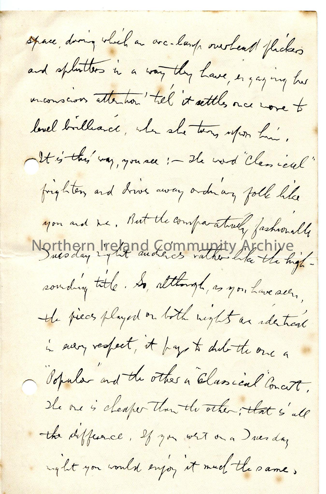 Page 6 of 24 page handwritten letter, on both sides of paper - author appears to have left Coleraine and now live in Glasgow. Mentions Irish Society School. Writes about classical music, Ibsen plays, a fanciful sketch his own, and Irish theatre, writers and myths and legends.