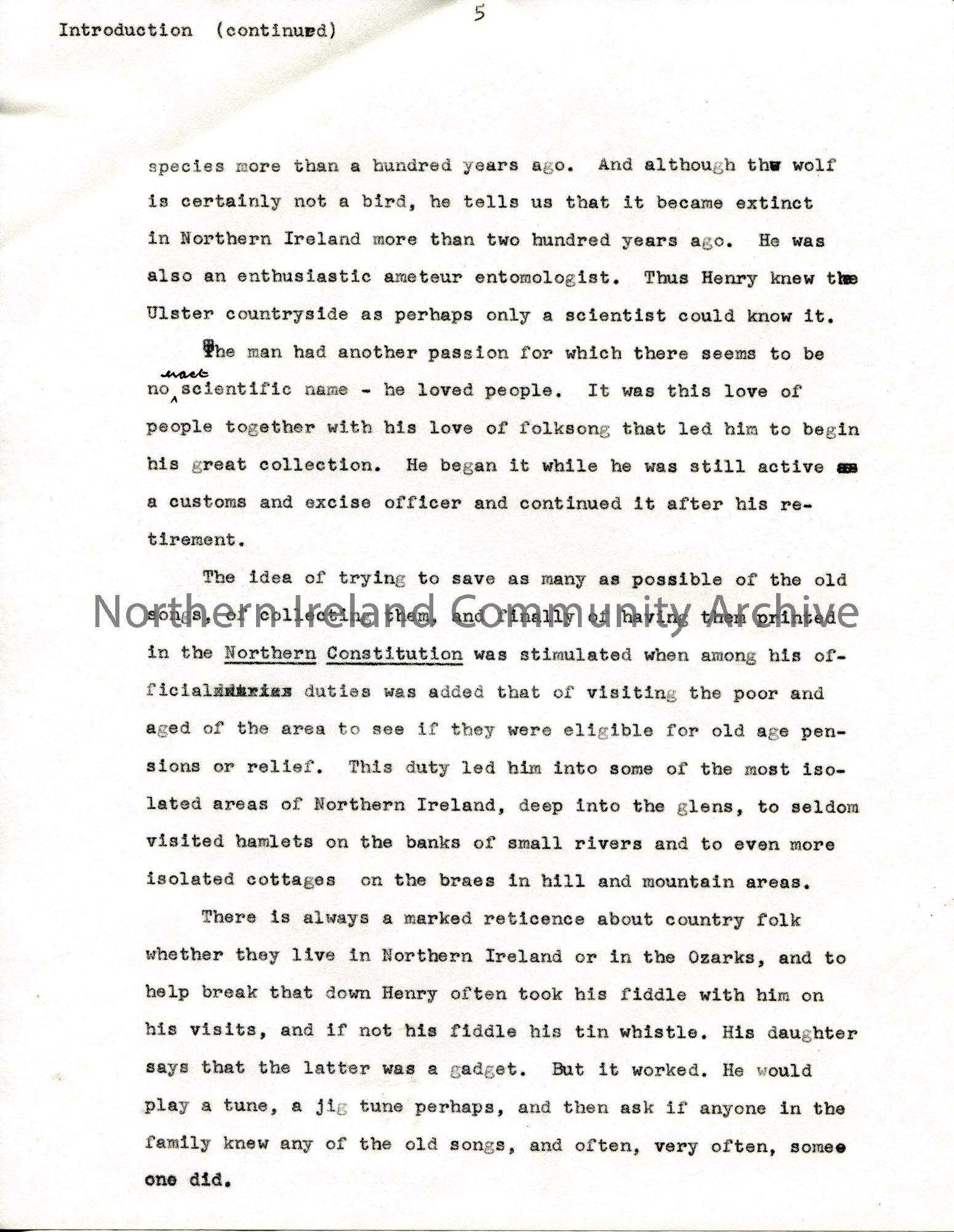 Page 6 of 28. Typed manuscript for Sam Henry’s Songs of the People edited by Gale Huntington. Annotated in black ink. Includes the introduction, text …