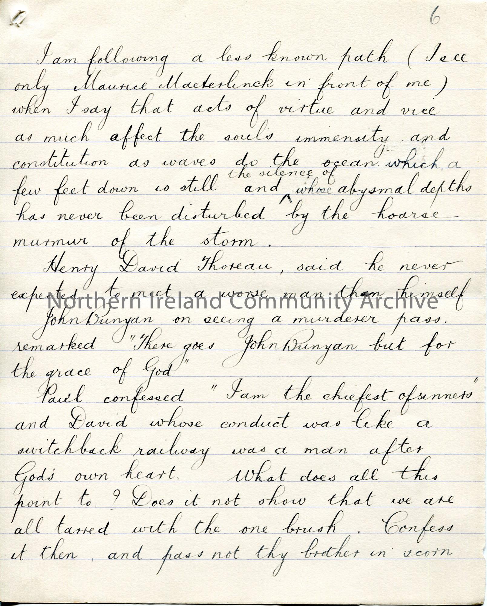 Page 6 of 38. Handwritten essay by Sam Henry titled, 'The Voice from the Ground'. 'Essay - Handshake' written in pencil above title. Re comradeship and Sam's encounters with various people. Contains rough notes on back of some pages of responses to the essay.
