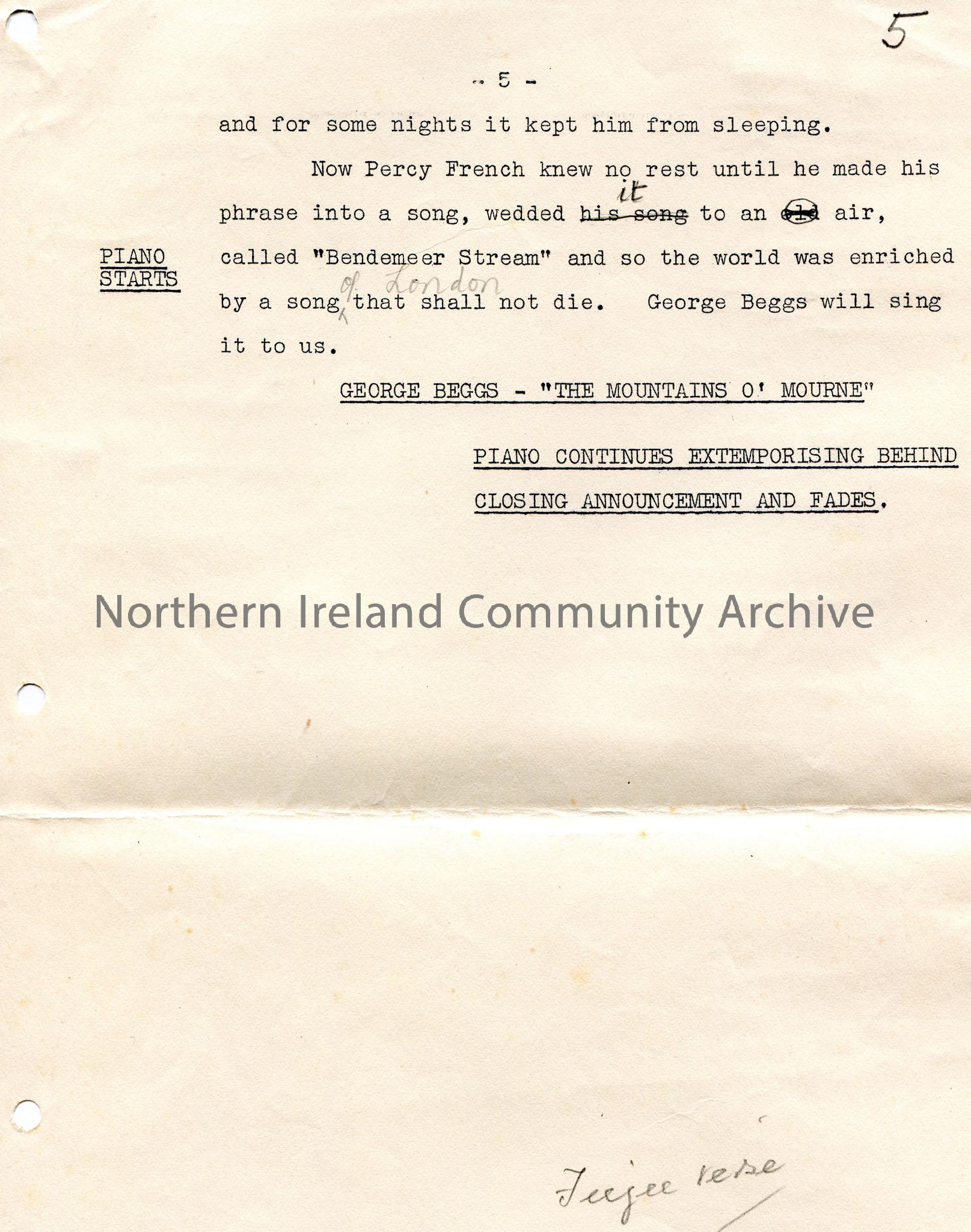Page 6 of 6 of a typed script for broadcast titled, ‘Phil the Fluter’s Ball’ from the BBC. Story of songs by Percy French narrated by Sam Henry. Part …