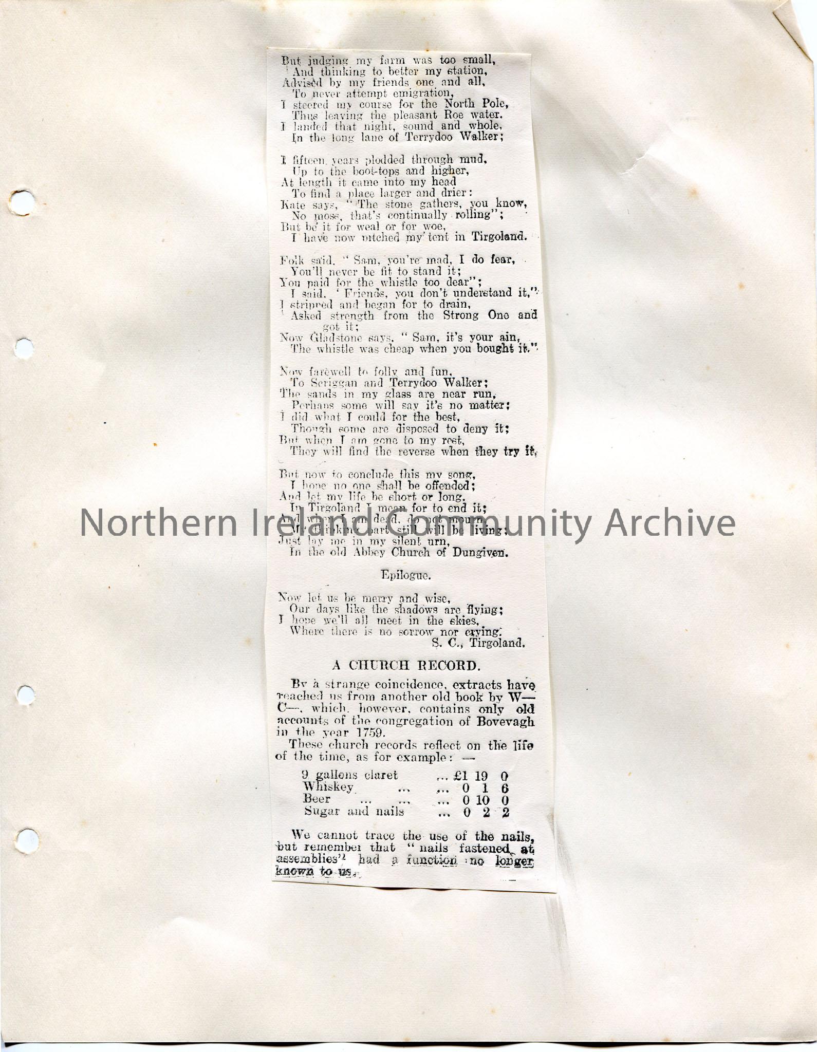Page 6 of 6 of newspaper cuttings stuck to paper titled, 'Roeside Memories. A Century-Old Commonplace Book. Miscellaneous Records of a County.' Re extracts from the book which include songs, poems, cures for ailments.