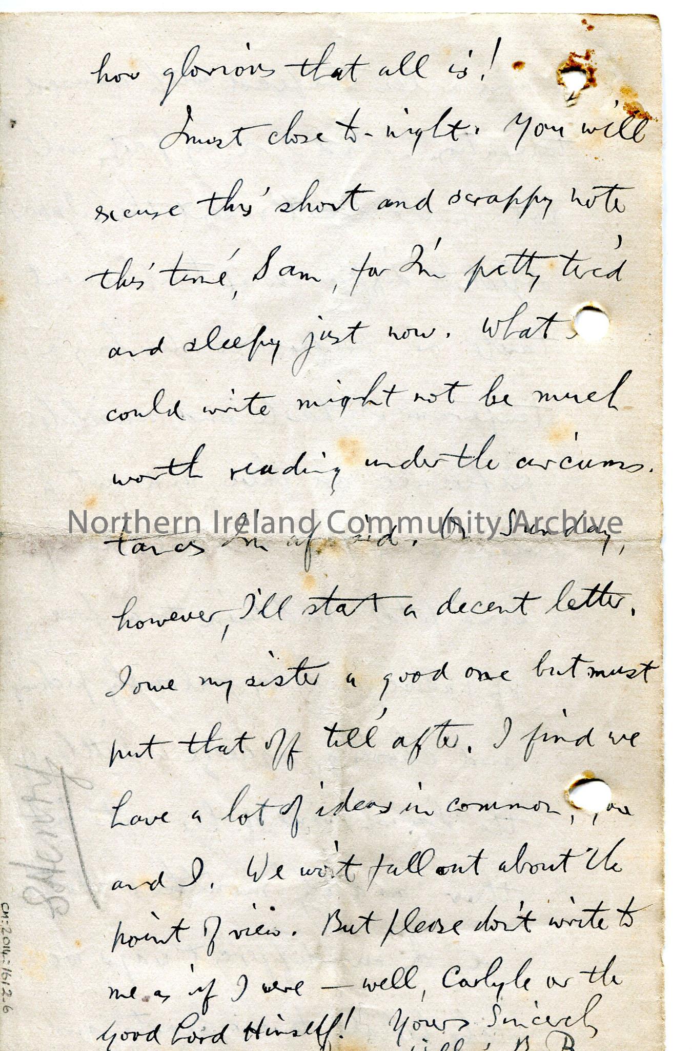 Page 6 of 6 page handwritten letter, on both sides of paper. Discusses his working hours, then a love of nature shared with Sam – elaborates, describi… – img075b