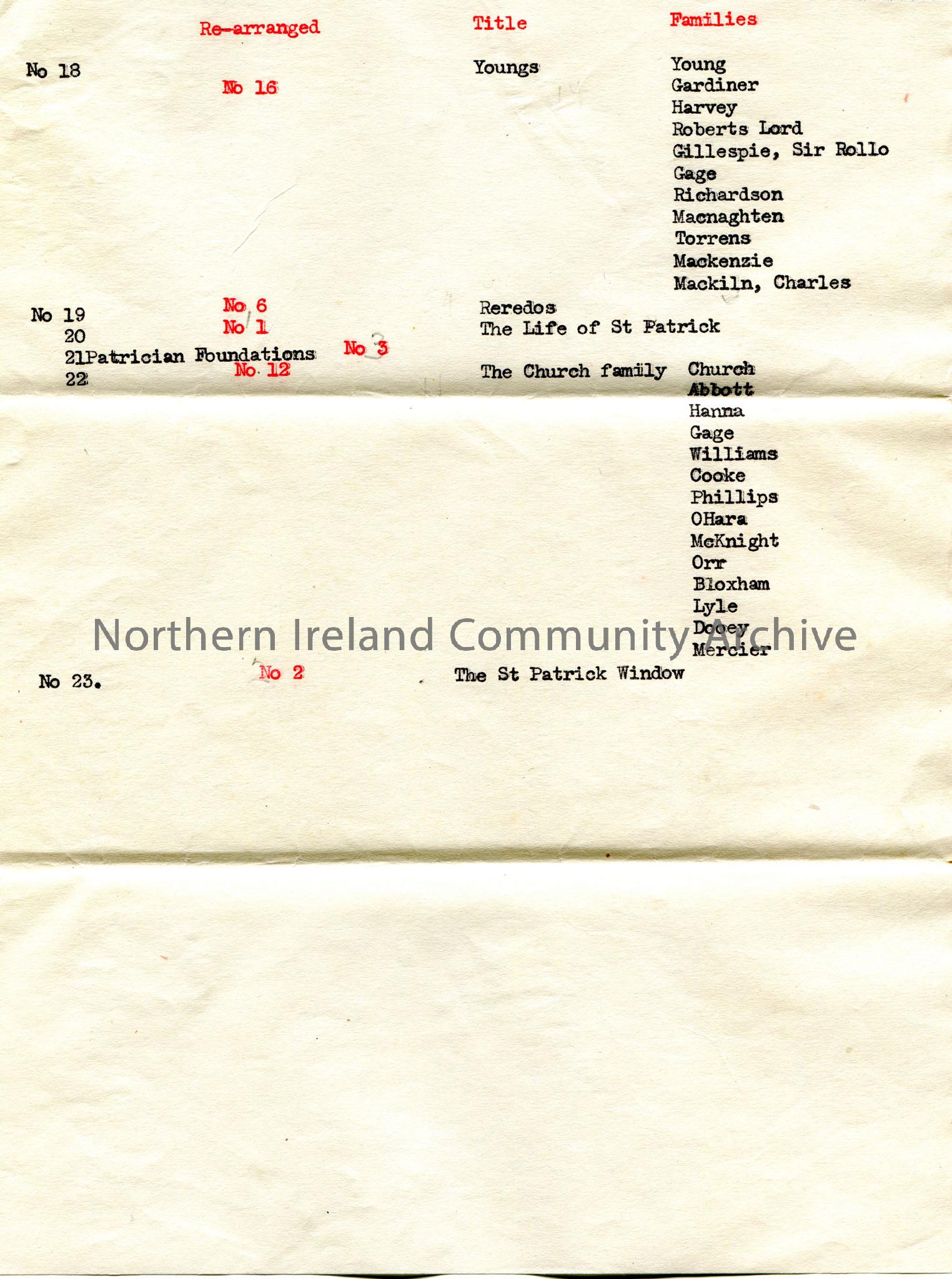 Page 6 of 6 pages of typed document. Numbered list of articles/chapters and family names.