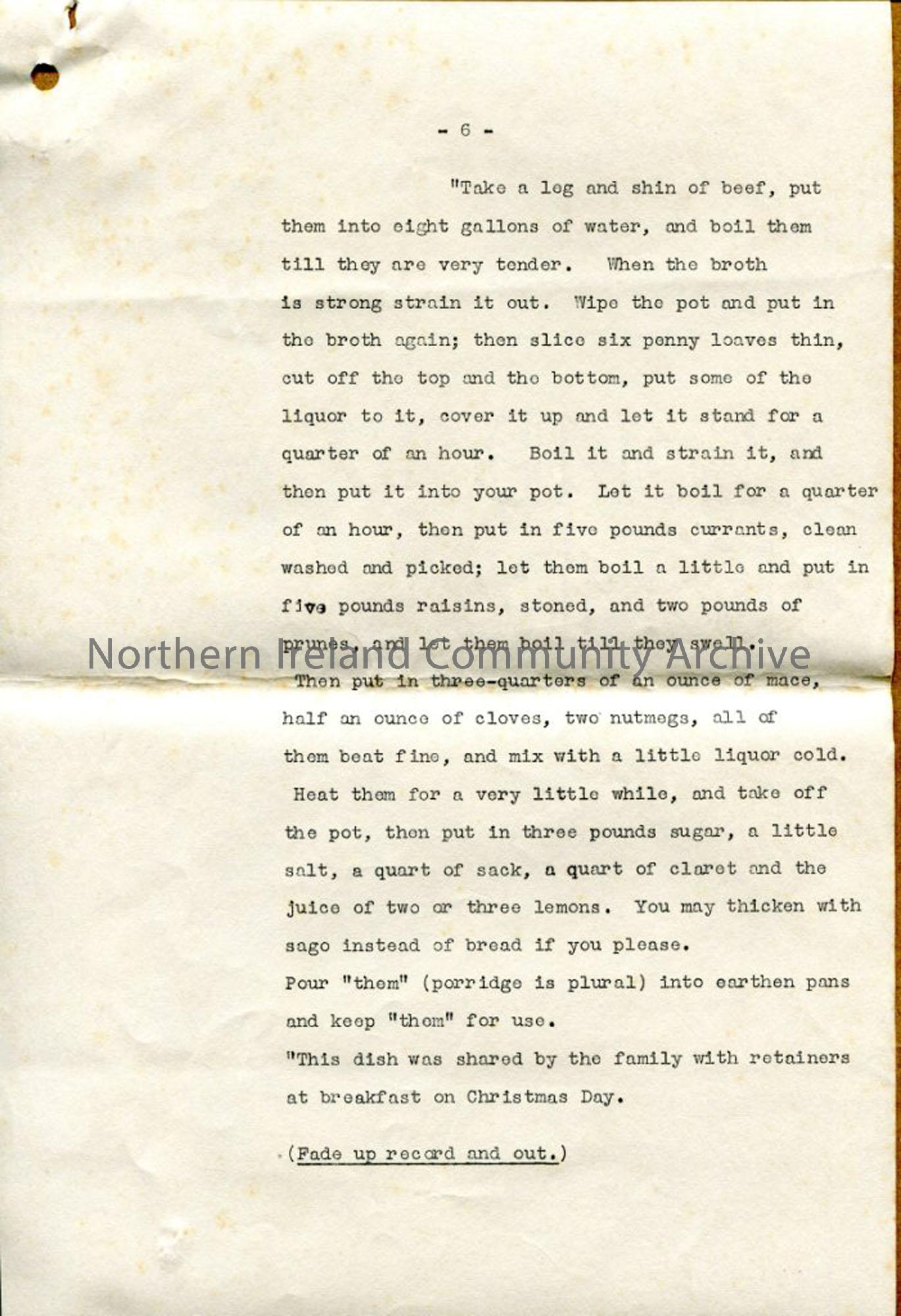 Page 6 of 6 - script, under heading 'Seasonal Fare', relating to 'Ulster Christmas' programme. Set out with parts for each speaker - about recipes, Christmas post - intercepted by Sam singing songs.