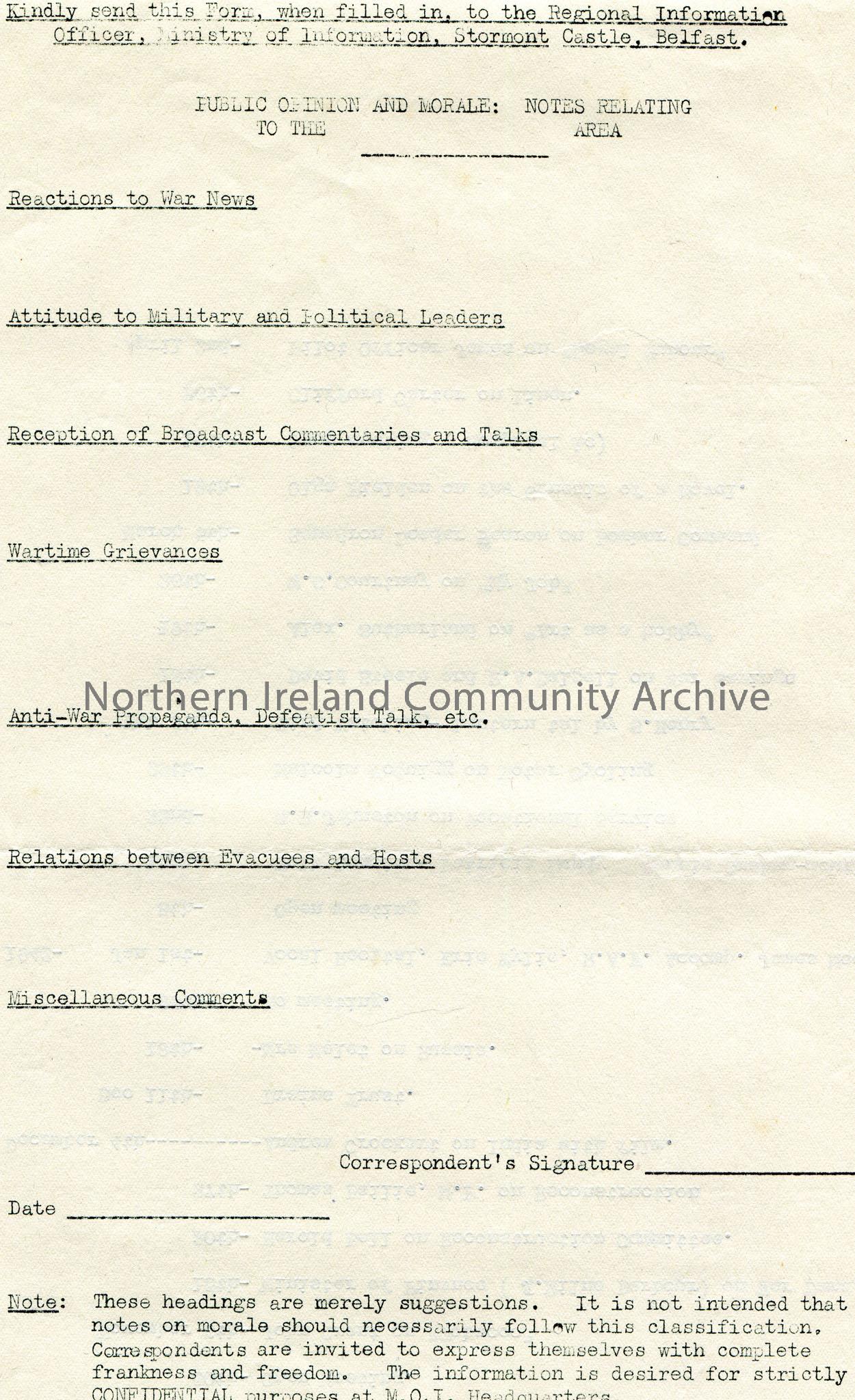 Page 6 of 6 titled 'Coleraine Rotary Club, Talks at Weekly Luncheons'. Dates from 2nd February, 1939-2nd April, 1942. On reverse of last page is a form re public opinion and morale to send to the Regional Information Officer, Ministry of Information, Stormont Castle, Belfast.