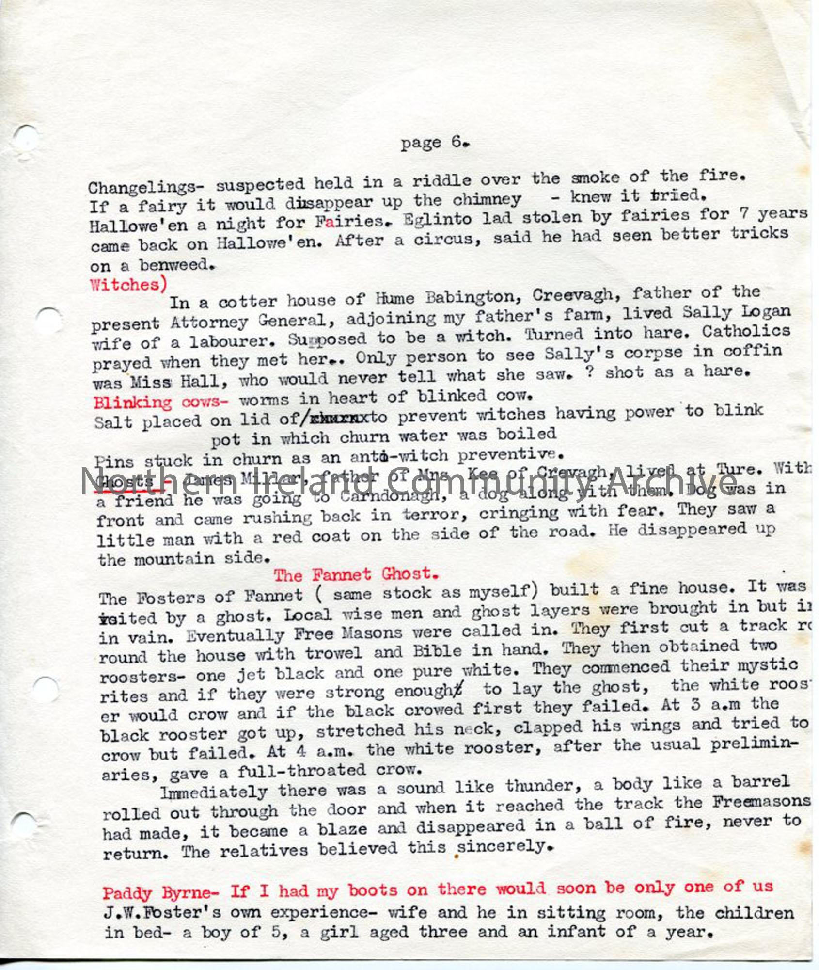 Page 6 of 7 typed pages under heading of 'Commonplace Book of J W Foster'. Contains sections on: Ulster Dialect, with definitions of words ; traditional practices/ cures for ills, with their attributed origins; folklore and ghost stories. Dated 17th April 1943.