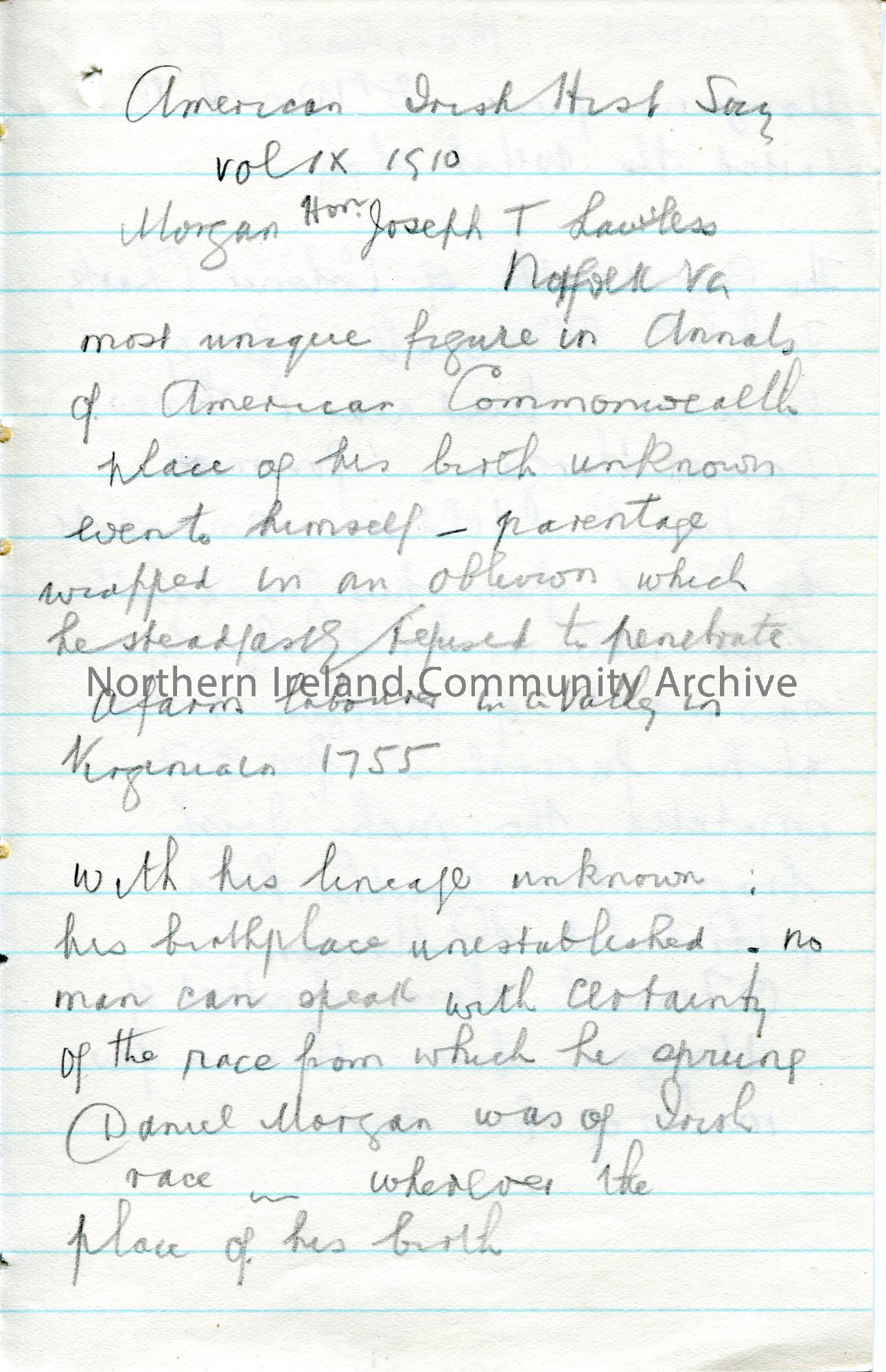 Page 6 of 7. Handwritten notes (double sided) in pencil on lined paper taken from a notebook re General Daniel Morgan, America.