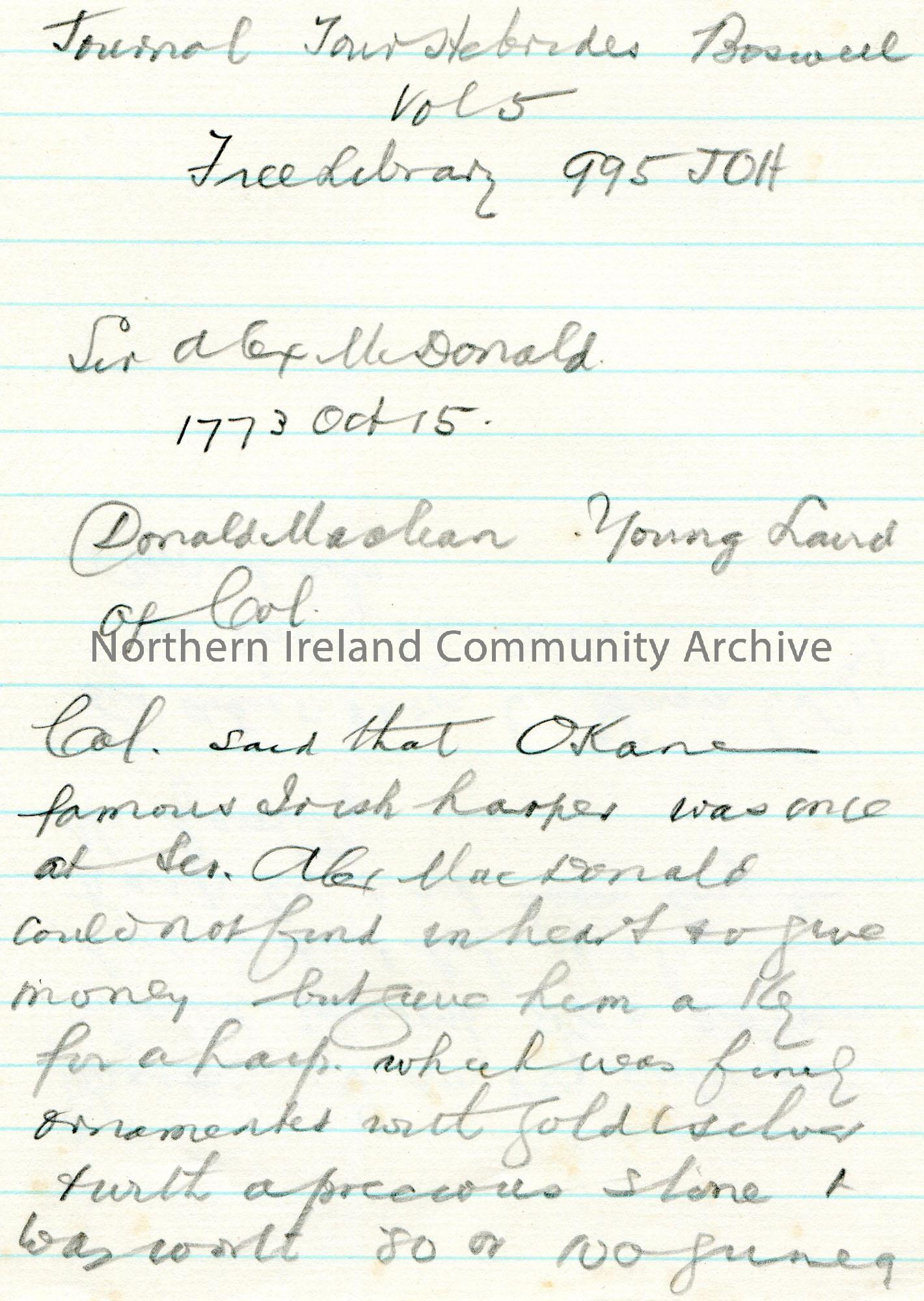 Page 6 of 7. Handwritten notes in pencil on lined paper. Not in context. Re surnames O’Neill, McDonald, O’Kane; harp.