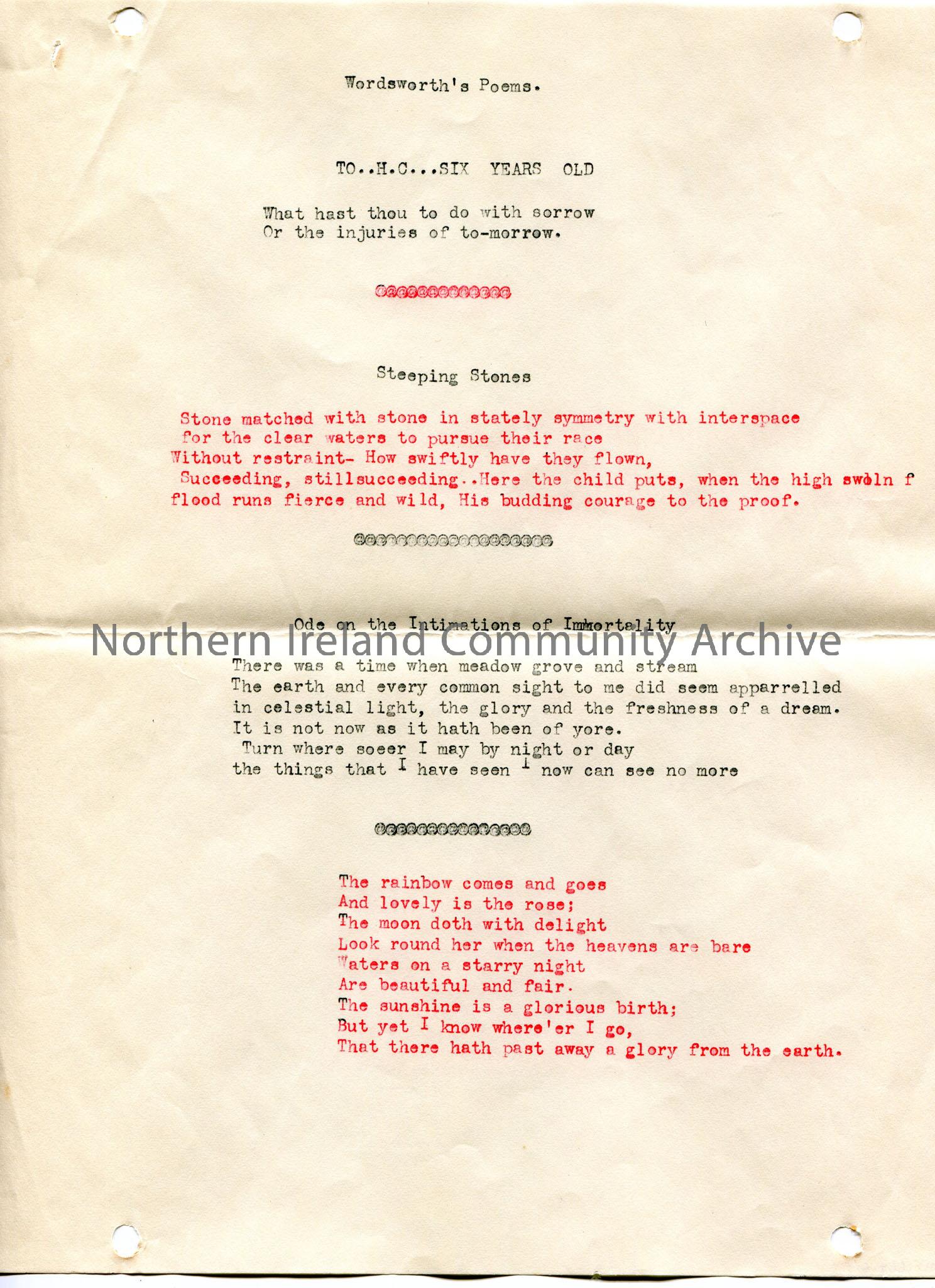 Page 6 of 7 of typed notes re lecture titled, 'The English Lakes' at Portrush on 15th February 1935. Typed page titled, 'Wordsworth's Poems' - two of which are titled, 'Steeping Stones' and 'Ode on the Intimations of Immorality'.