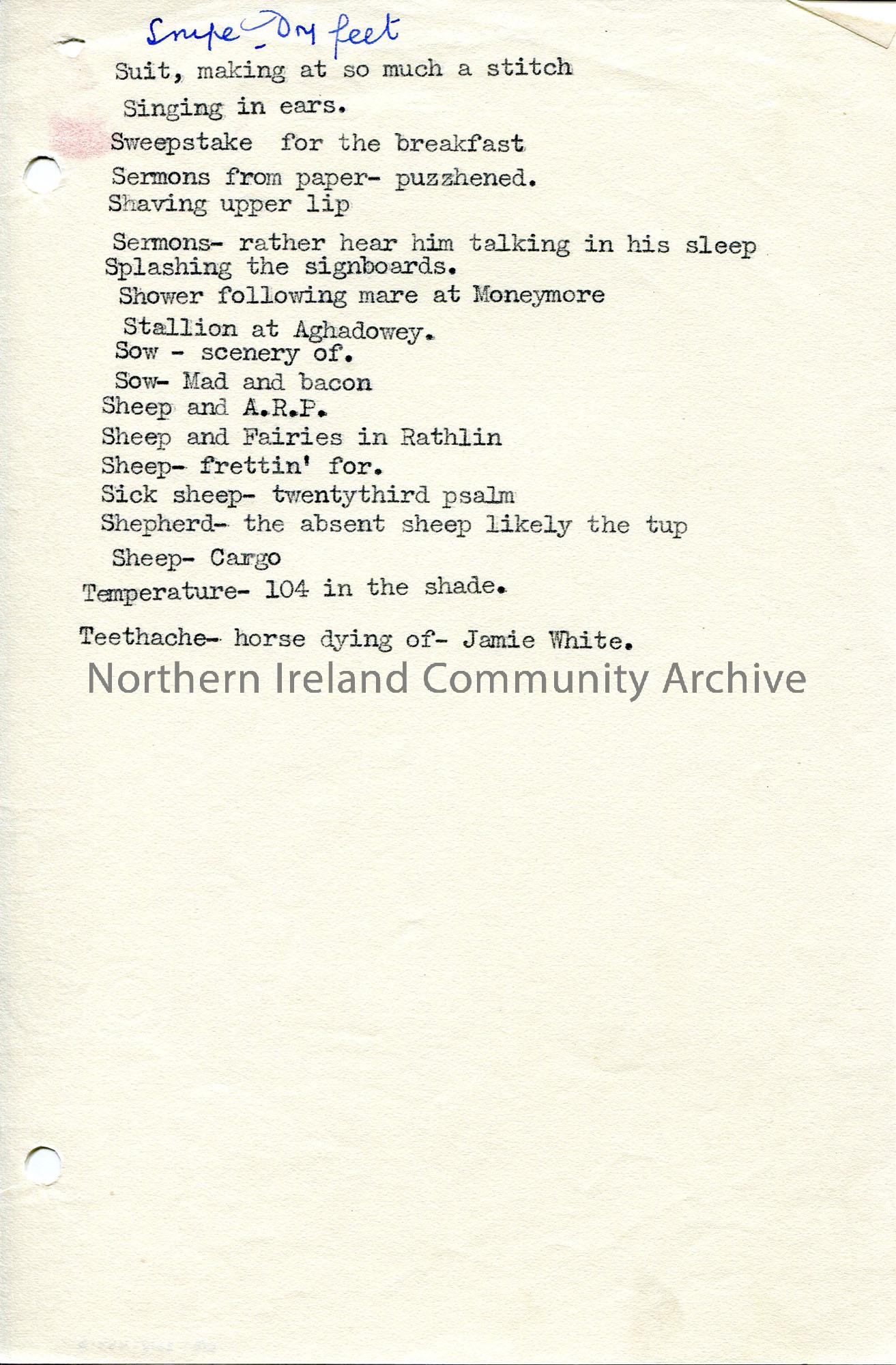 Page 6 of 7. Typed list in alphabetical order of notes. This page has S-T notes. A lot of the words refer to animals.