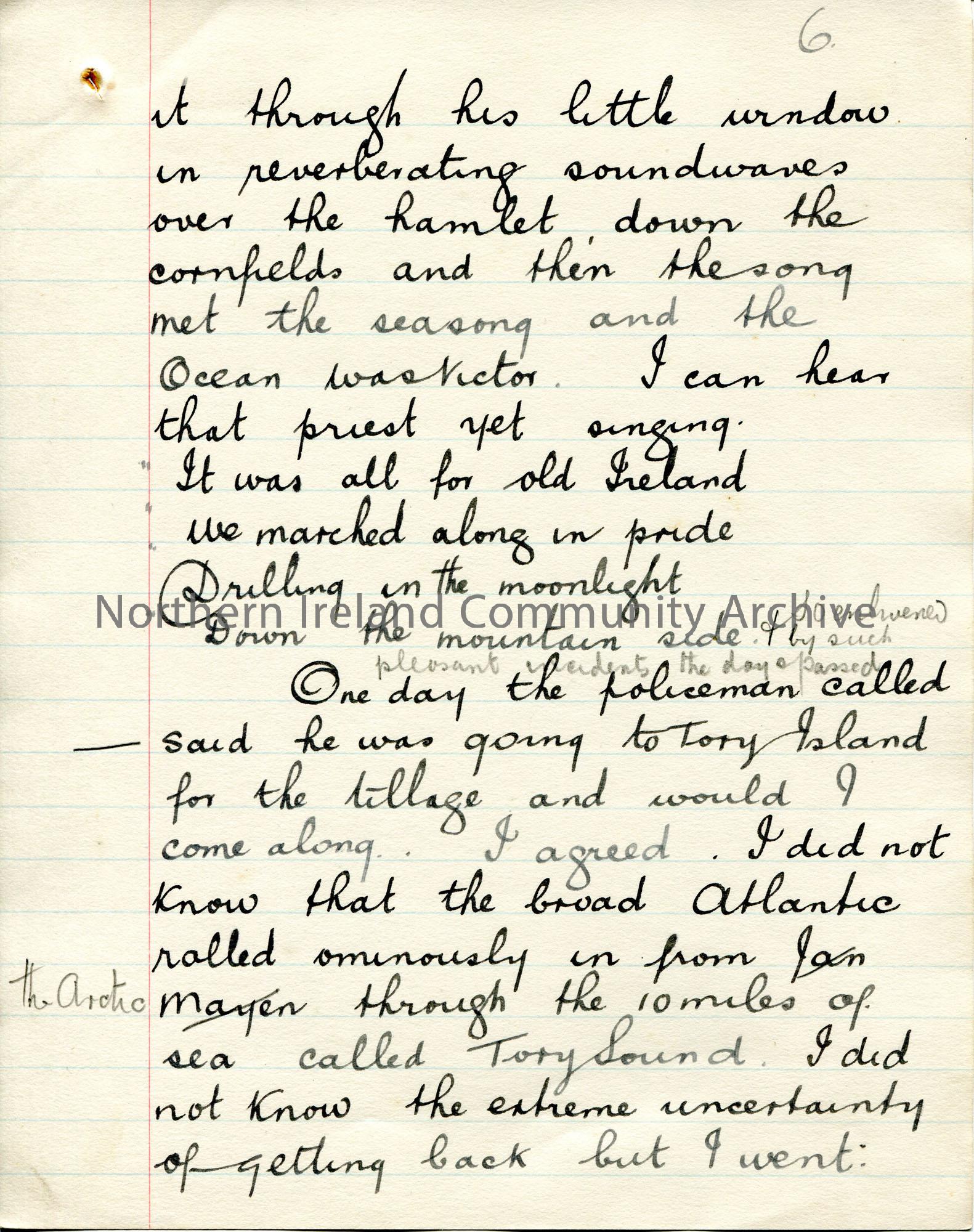 Page 6 of 71. Handwritten, rough essay [ for a talk? ] by Sam Henry titled 'Here and There in the King's Service'. Dated 1909 by JM. Sam Henry talks through his first 15 years of service as an Exciseman. He was based at Falcarragh, Ballymote in Co. Sligo, Lancashire, Uffculme and Omagh in Co. Tyrone.