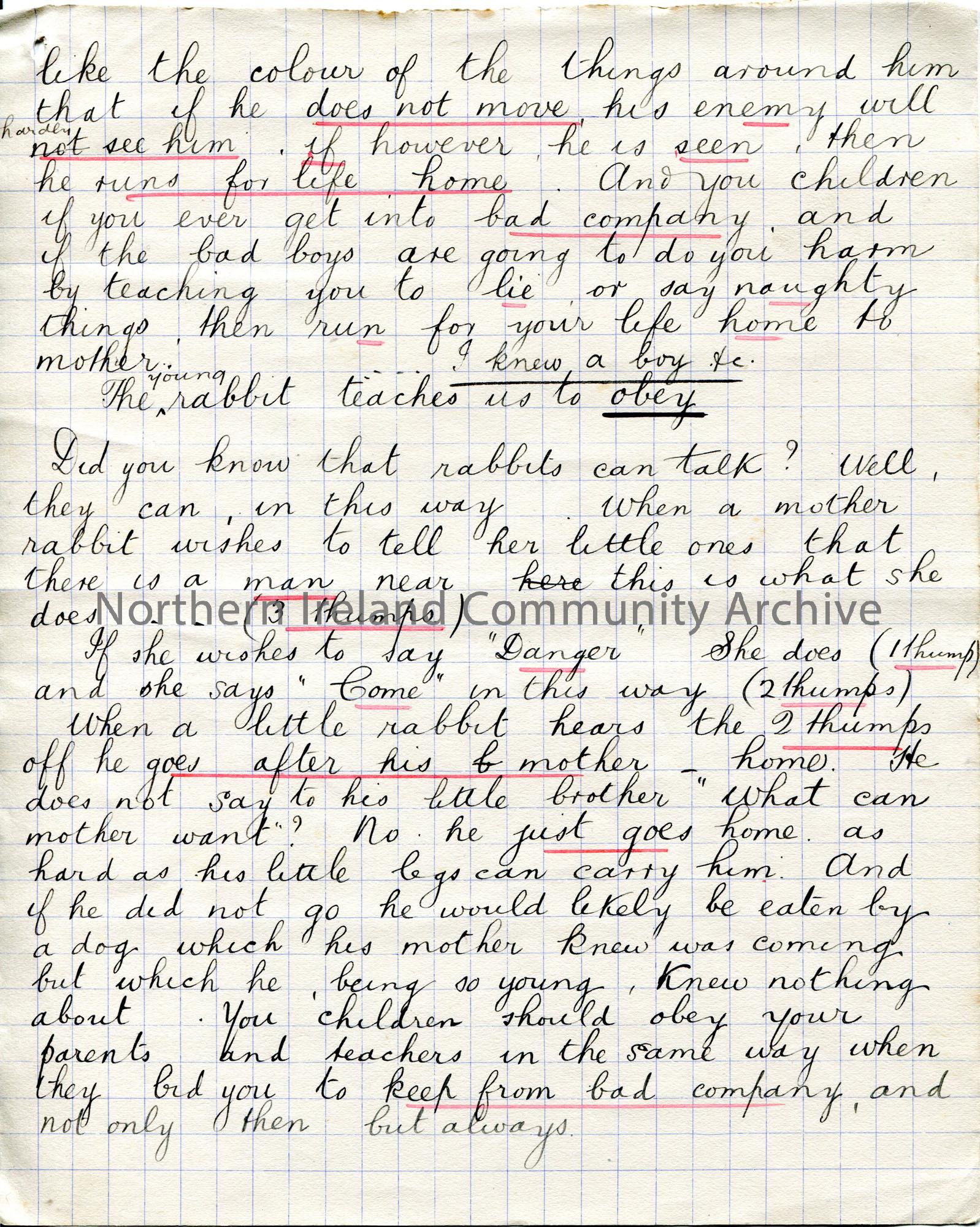 Page 6 of 8. Handwritten story titled, 'A Country Walk'. By Sam Henry, Chorley in 1903. Directed towards children and refers to God, daisies, Robins and talking rabbits.