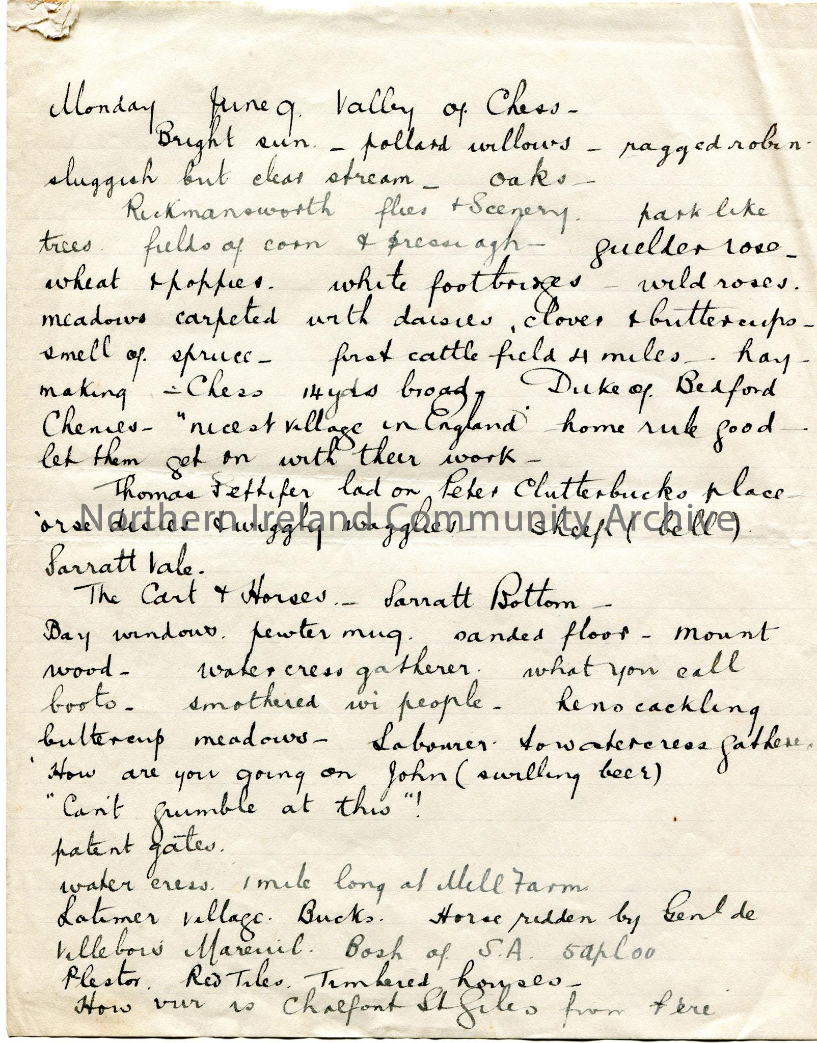Page 6 of 8 of handwritten notes titled, ‘Holiday 31 May-19 June 1913’. Details of daily activities of travels around England.