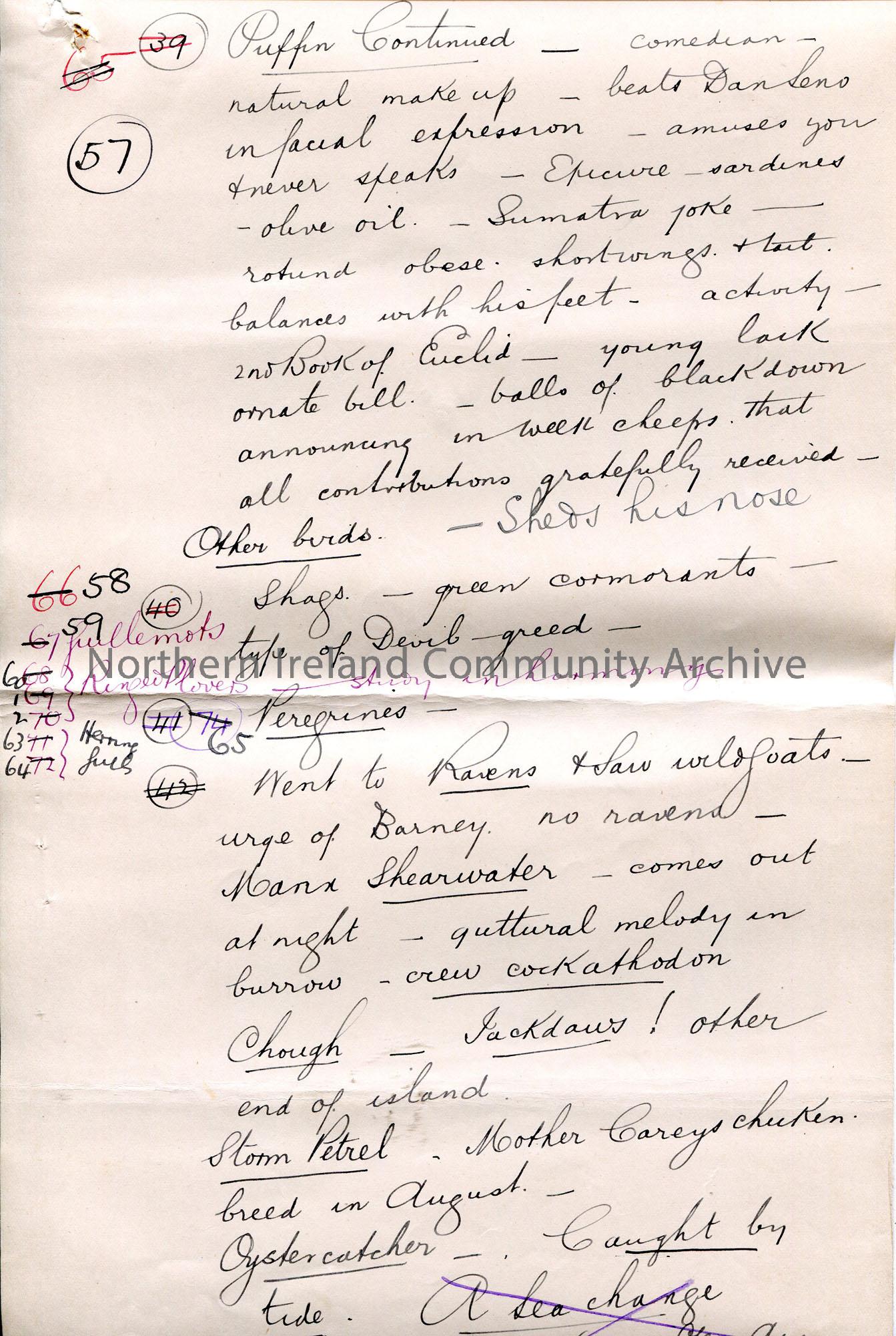 Page 6 of 9. Handwritten rough notes for a lecture by Sam Henry re Rathlin – The Voyage Out. Numbered for slides 42-68. Mentions spinner Rosy Black, B…