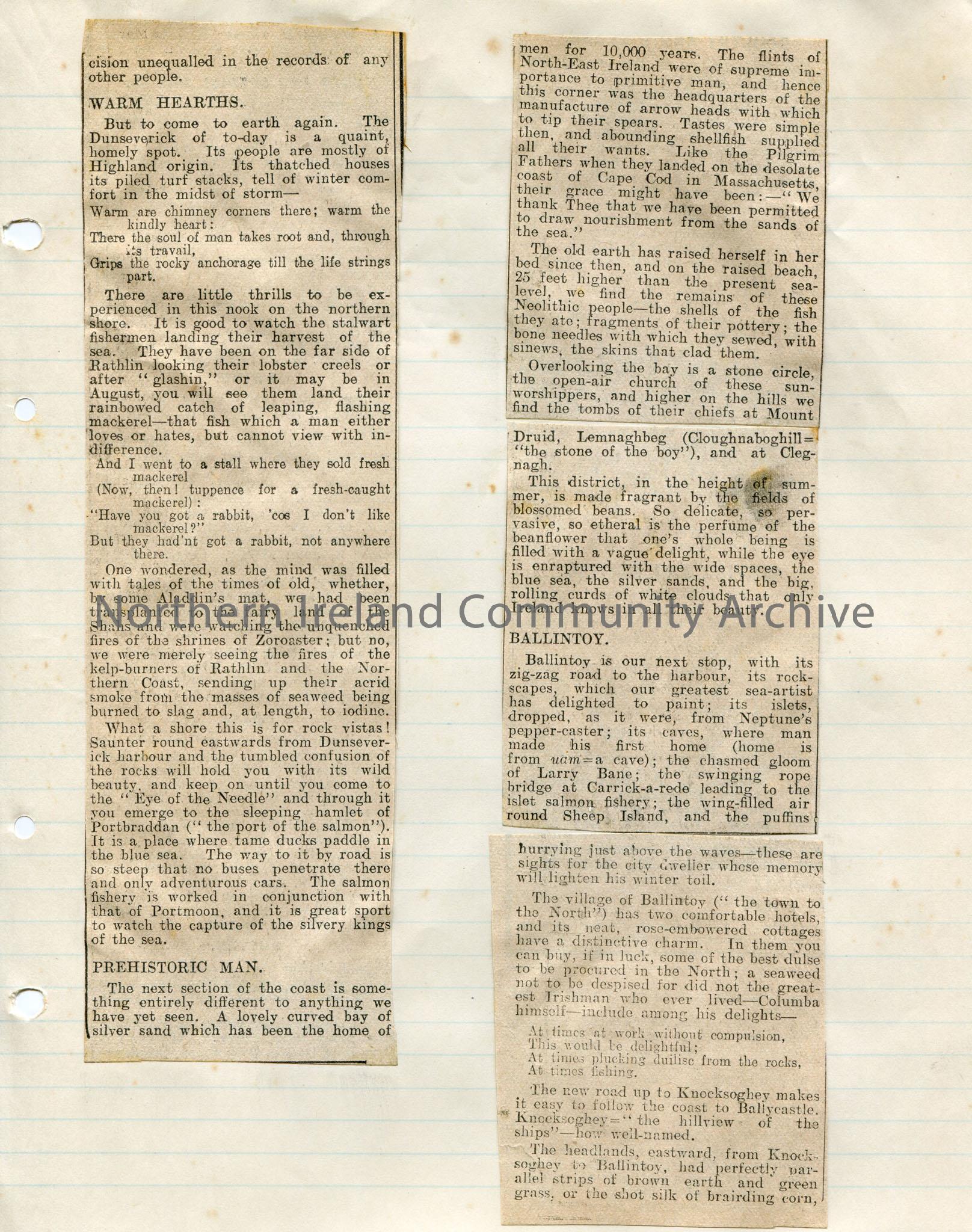 Page 6 of 9 of newspaper cuttings stuck to lined paper titled, ‘Causeway to Cushendall. Beauty of Dalriada Seaboard. Antrim’s Incomparable Coast.’ Art…